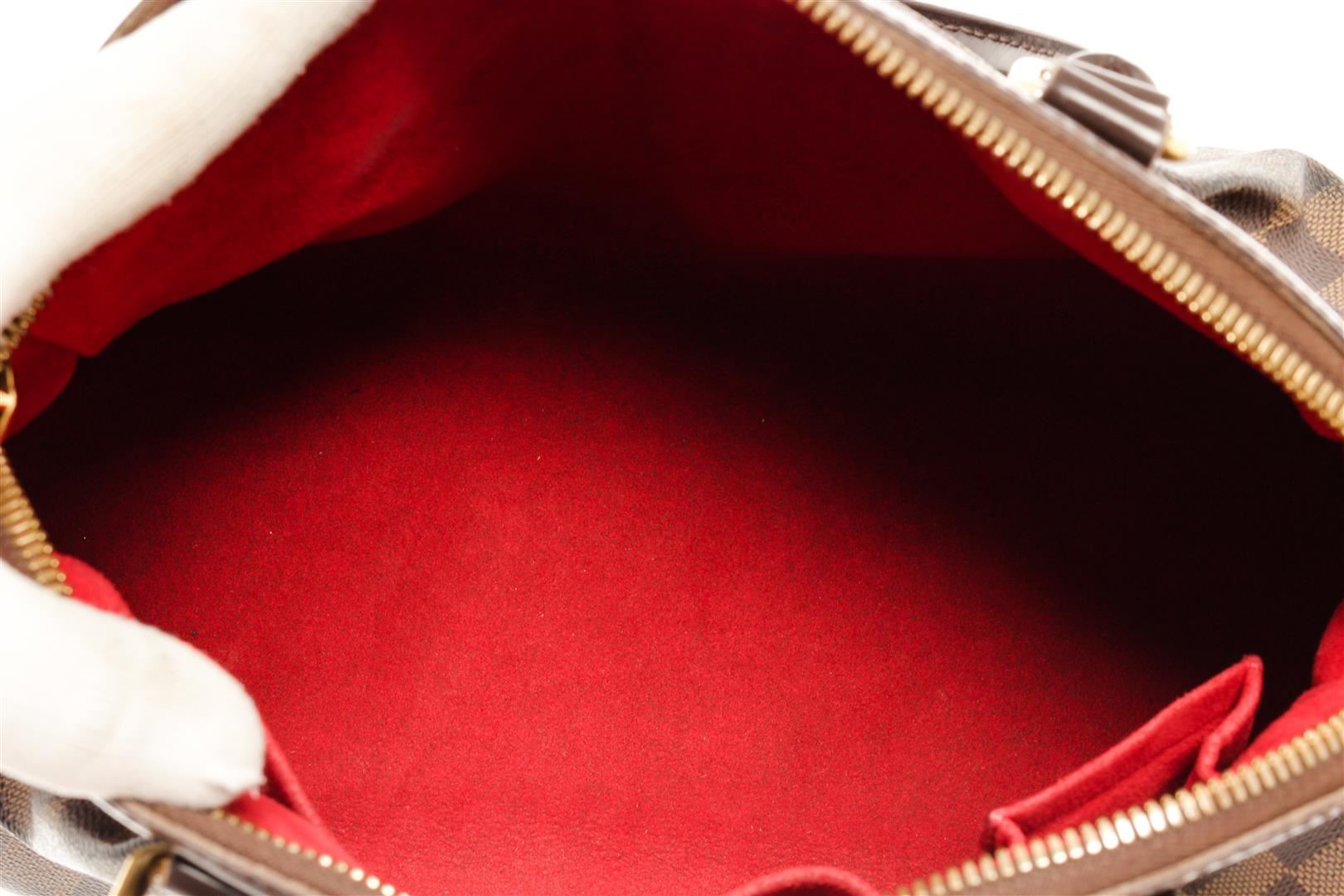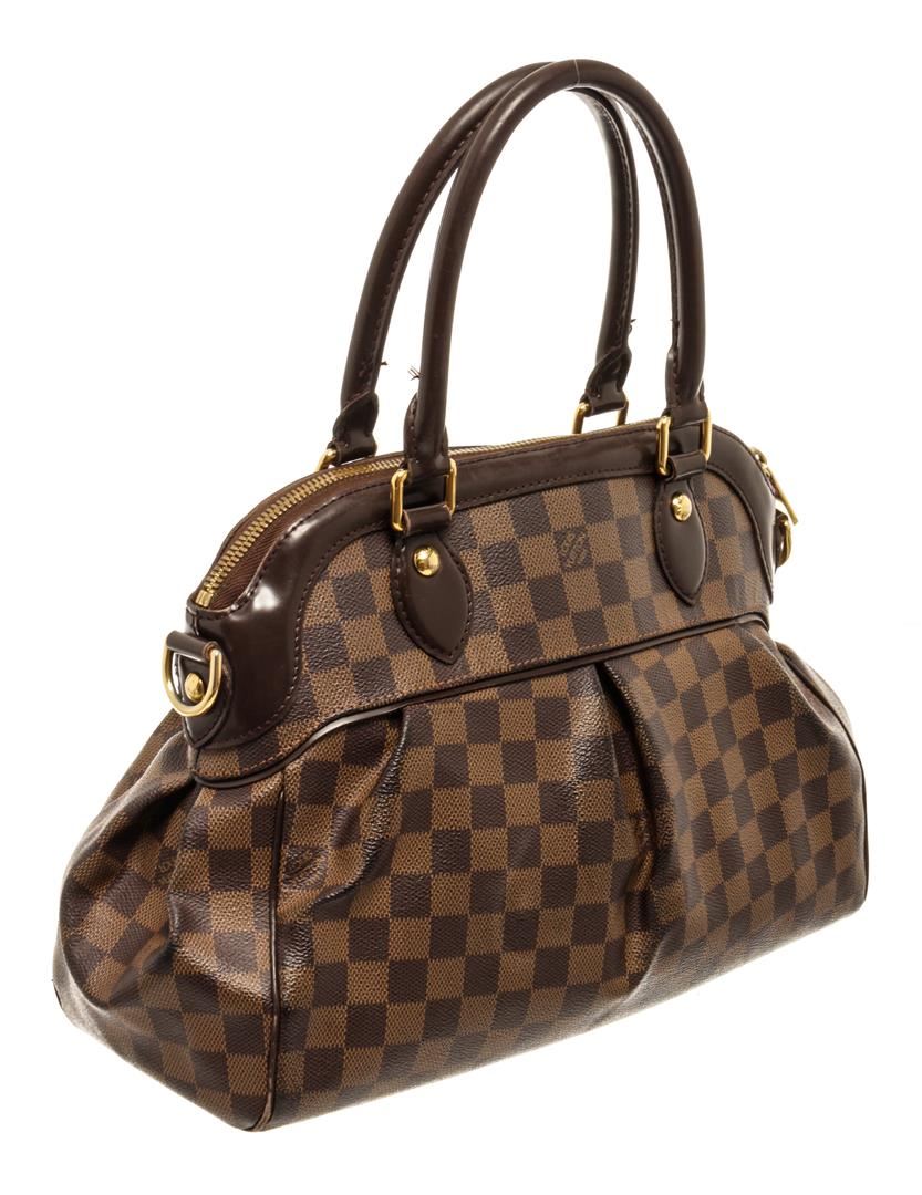 One Louis Vuitton Brown Damier Ebene Trevi PM Shoulder Bag. Item is sold AS-IS. All available information is listed in the description and shown in the photo. Louis Vuitton Brown Damier Ebene Trevi PM Shoulder Bag with damier ebene pattern, brass hardware, leather trim, rolled handles & single adjustable shoulder strap, alcantara lining & dual interior pockets, zip closure at top, protective feet at base Height: 10" Width: 14" Depth: 5.5", Handle Drop: 5.5" / 25.4 x 35.5 x 13.9 Cm