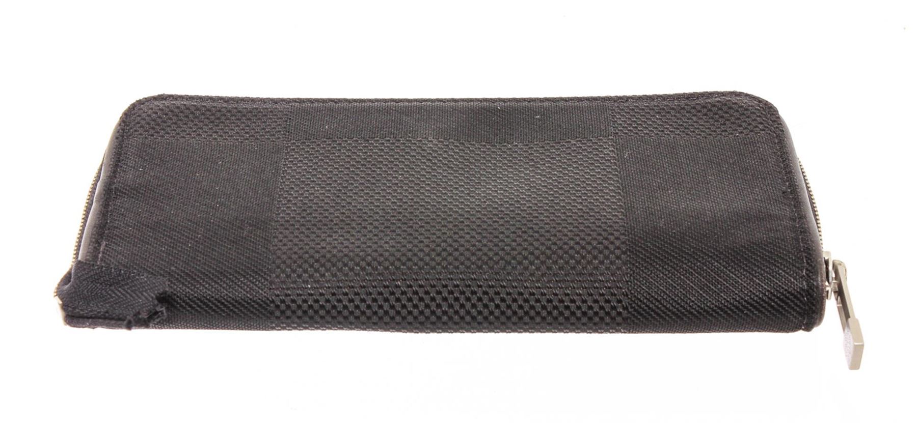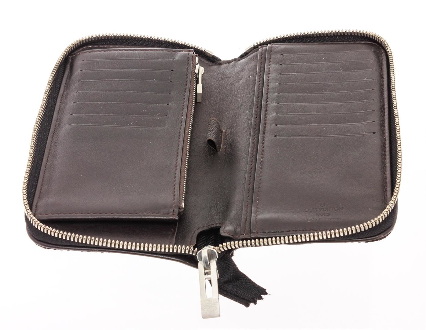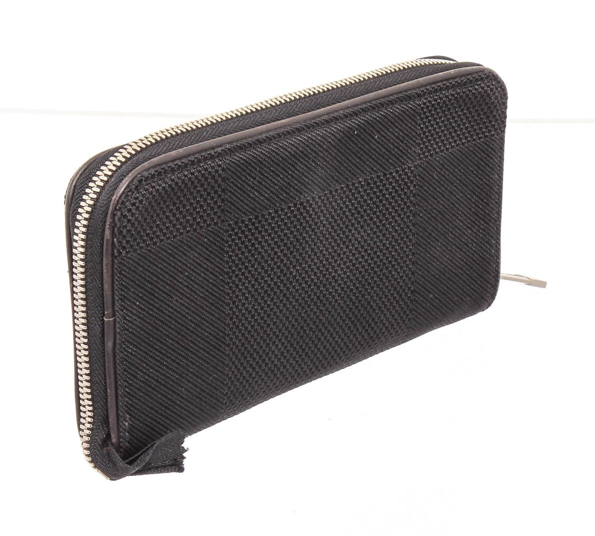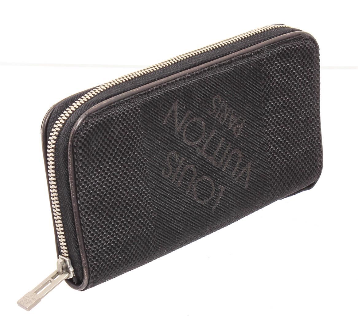 Black damier geant canvas Louis Vuitton zippy wallet with silver-tone hardware, tonal leather lining, fourteen card slots, two bill slots, two compartments; one with zip closure, pen holder and over all zip around closure.