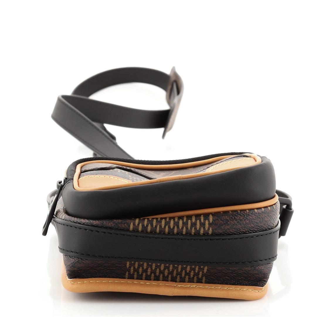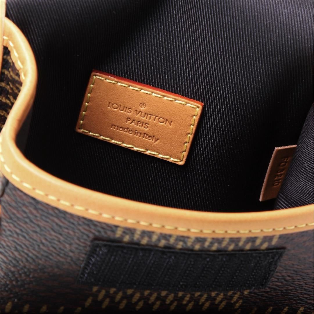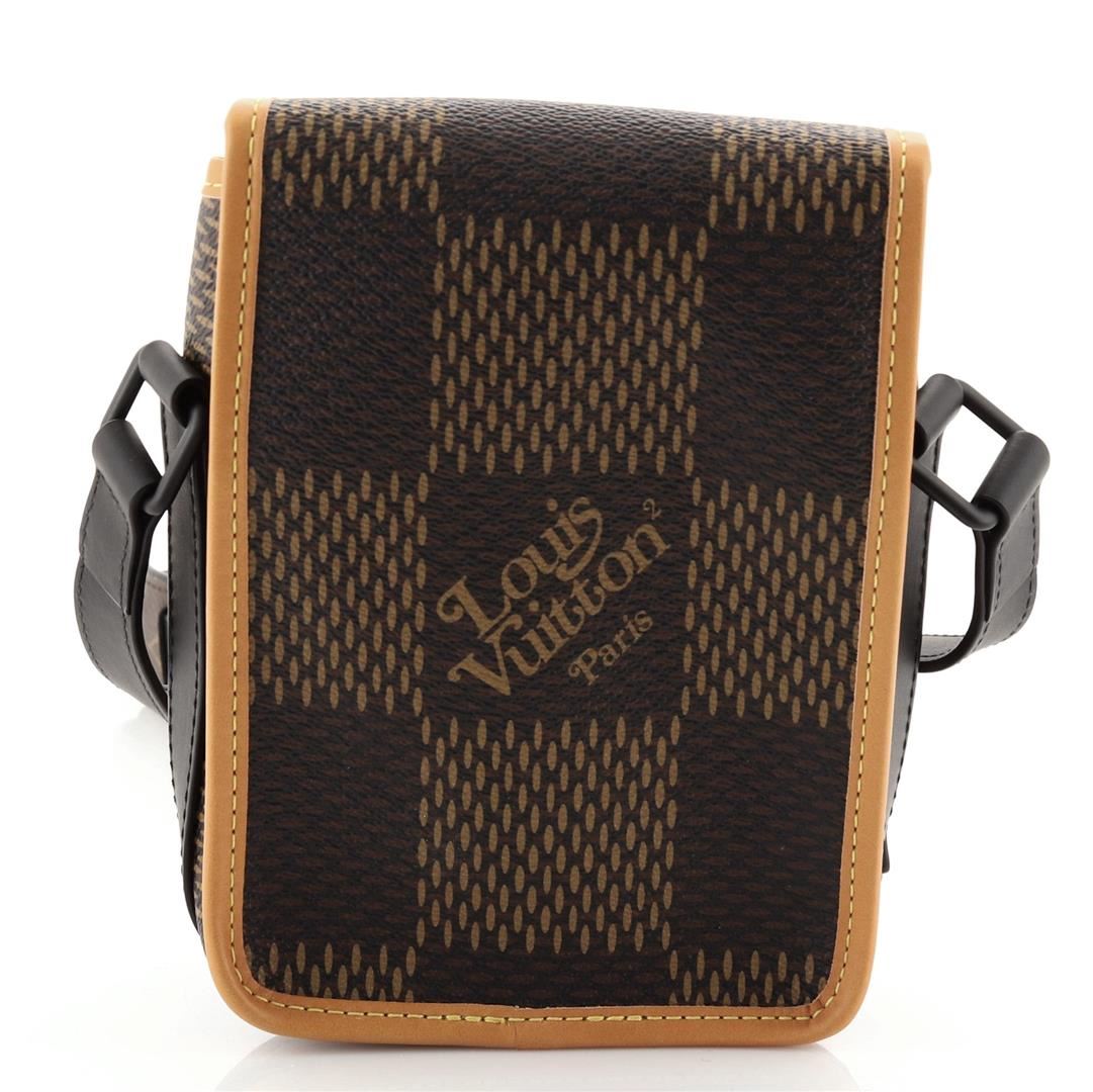 Louis Vuitton Nigo Amazone Nano Messenger Bag features giant Damier Ebene coated canvas and drip brown Monogram coated canvas at the front pocket, brown textile lining, cowhide leather trim, matte-black hardware, adjustable shoulder strap and flap top ove