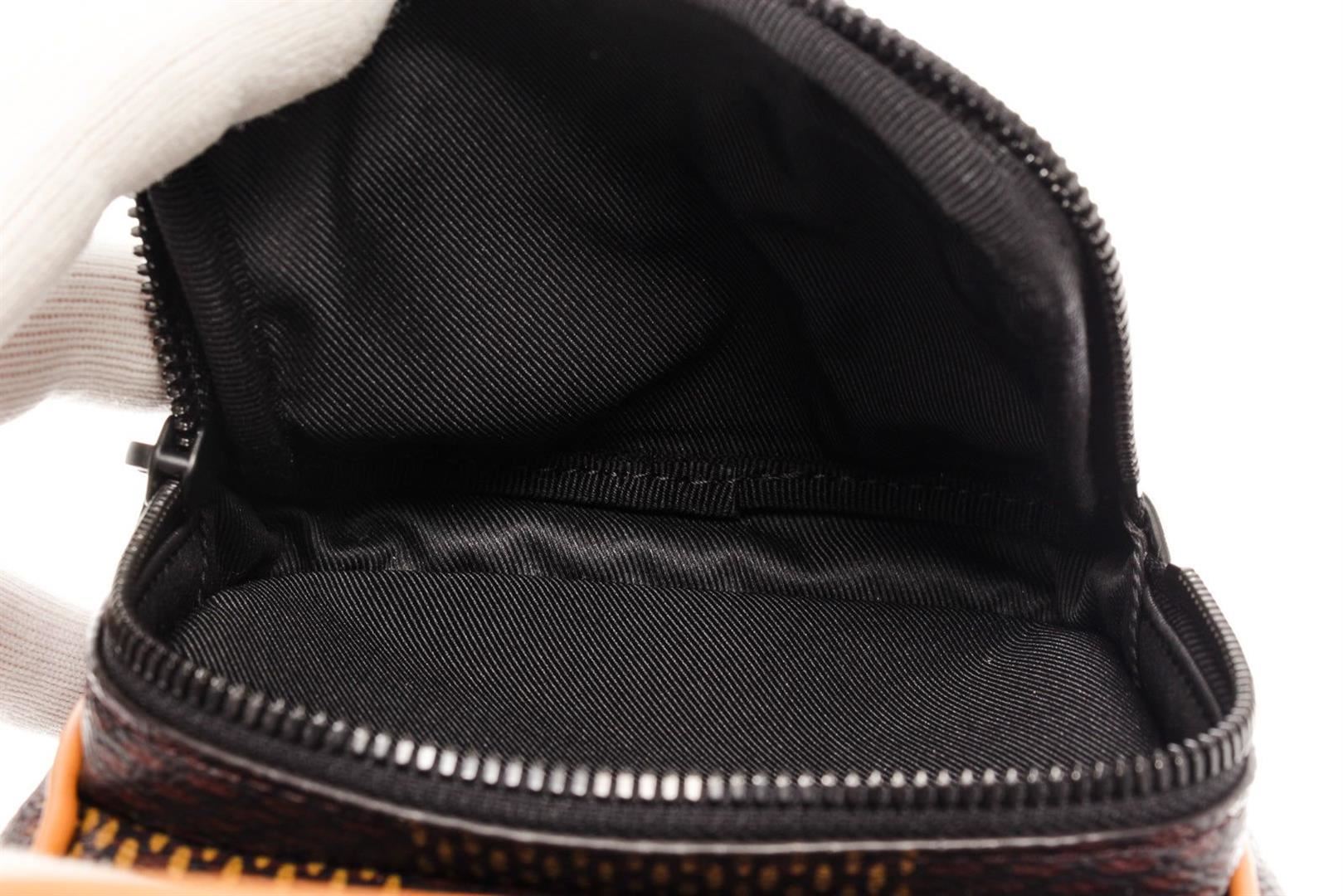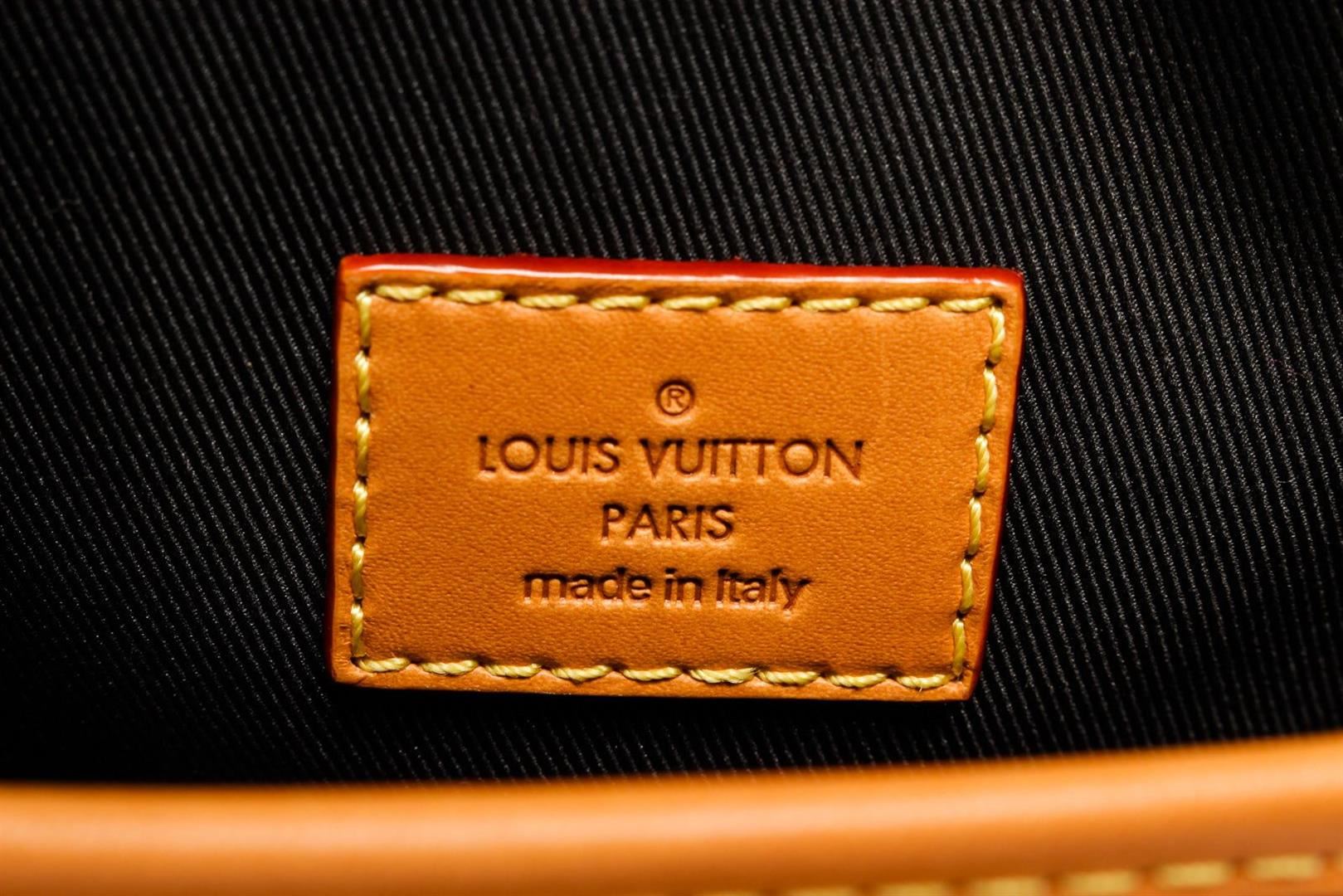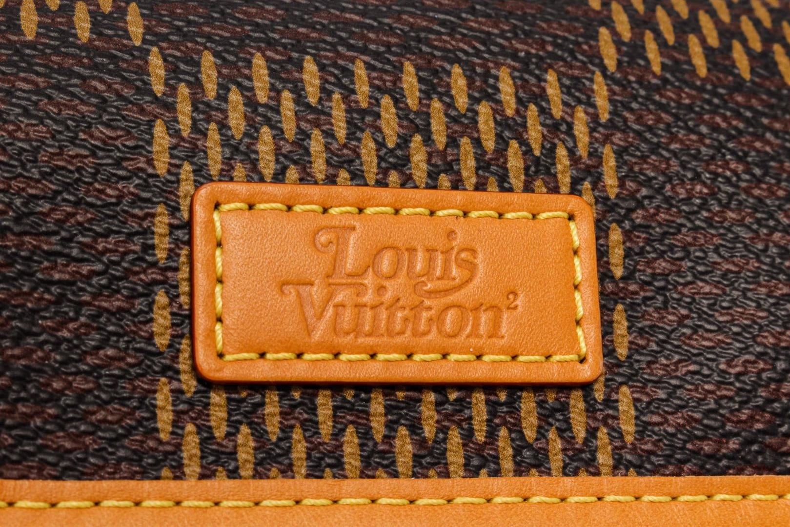 Louis Vuitton Nigo Amazone Nano Messenger Bag features giant Damier Ebene coated canvas and drip brown Monogram coated canvas at the front pocket, black textile lining, cowhide leather trim, matte-black hardware, adjustable shoulder strap and flap top ove