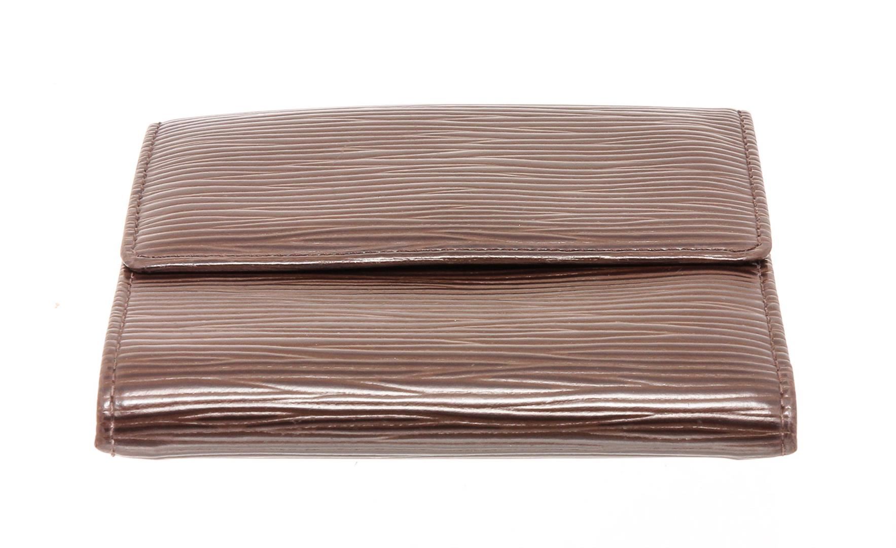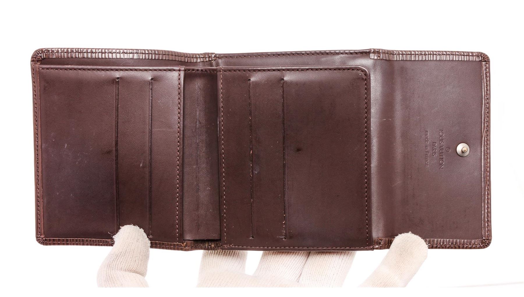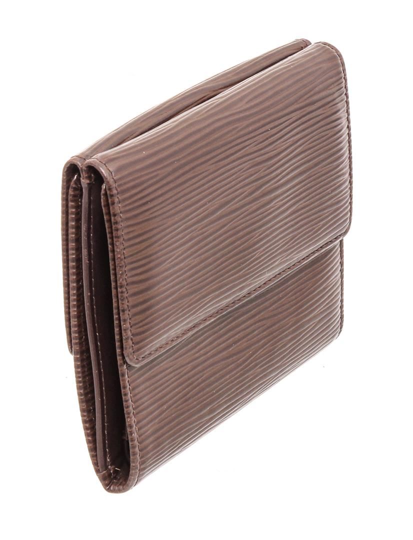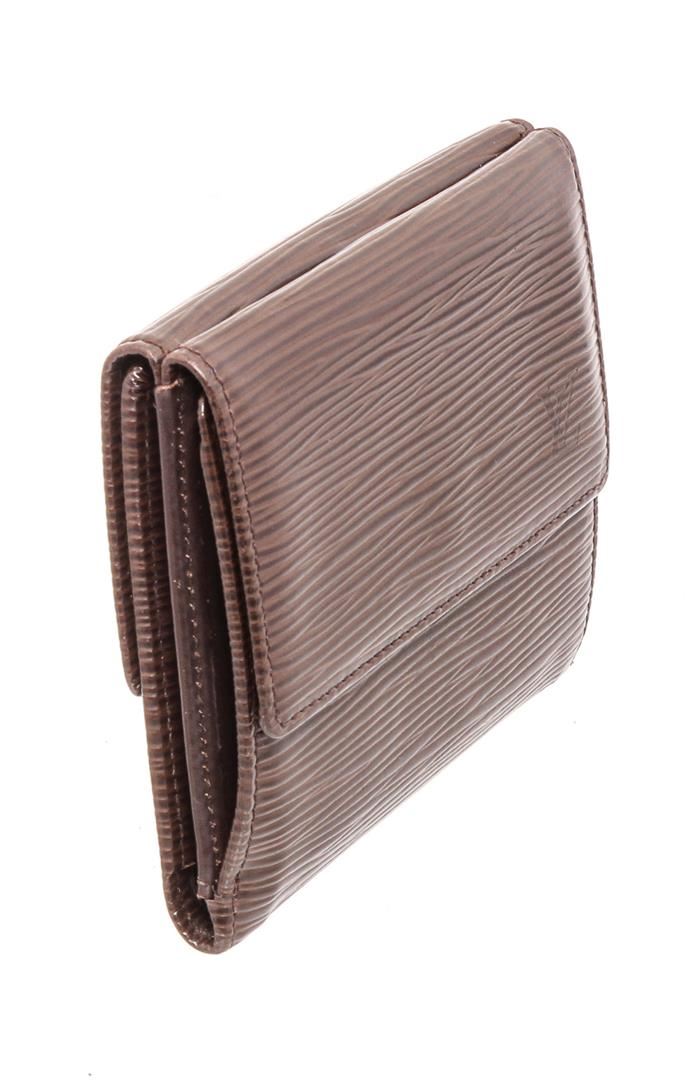 Brown Epi leather Louis Vuitton Elise compact wallet with brass hardware, embossed monogram accent at front face, single exterior pocket featuring snap closure, tonal leather lining, single bill compartment, six card slots and snap closure.