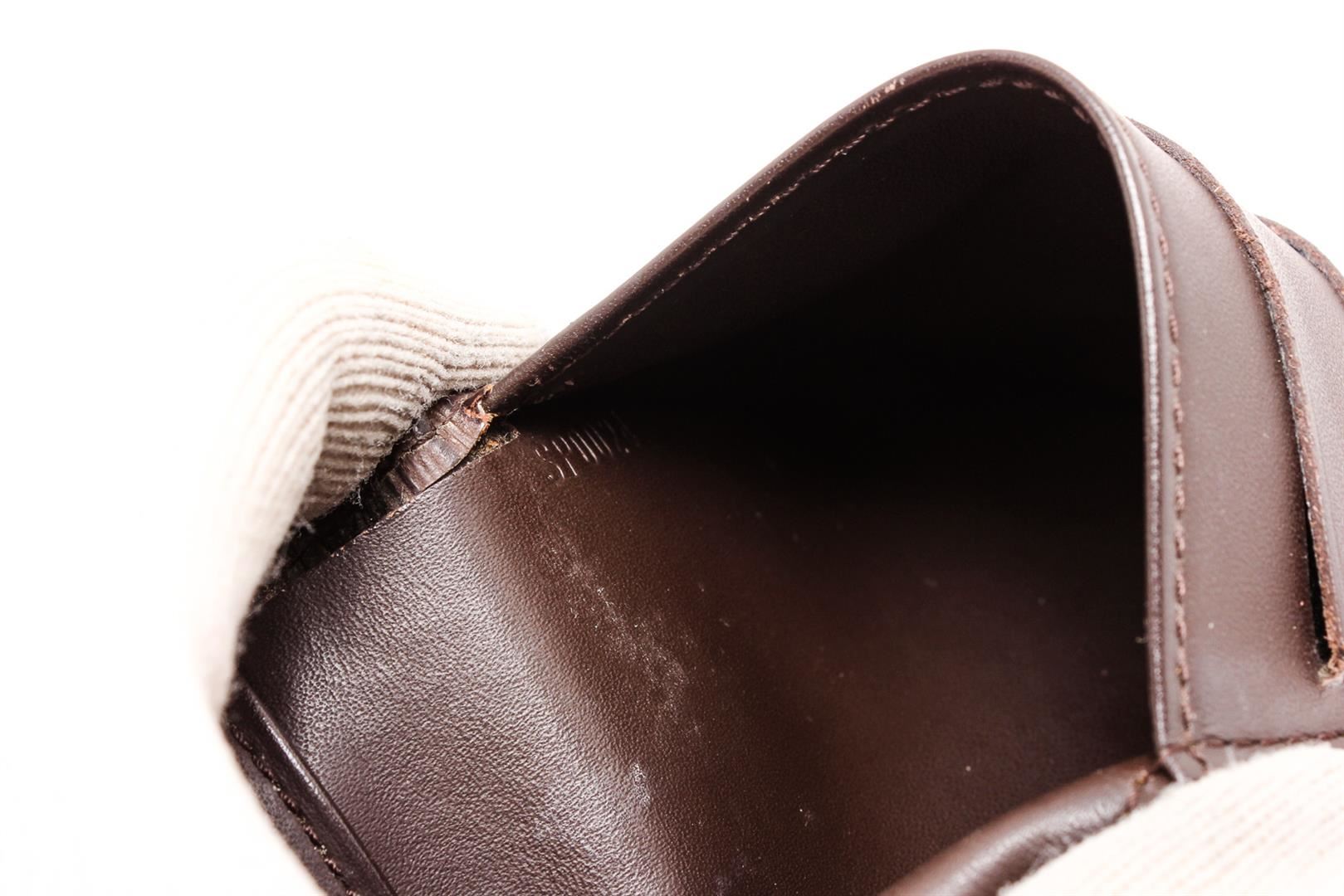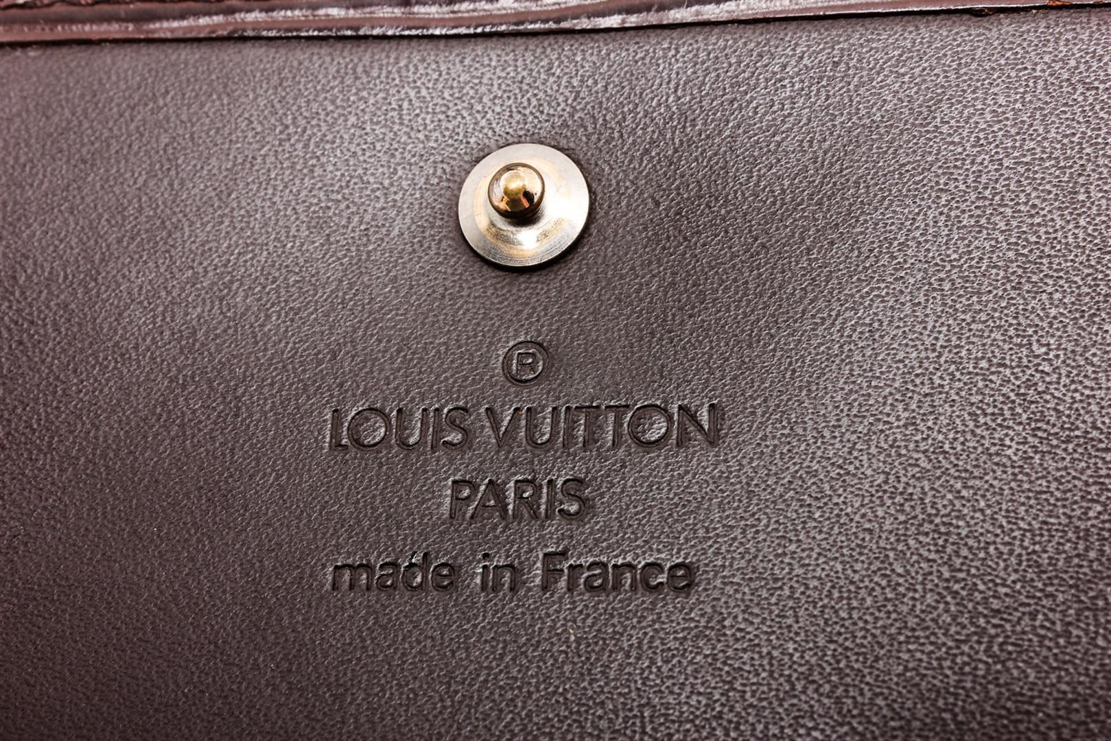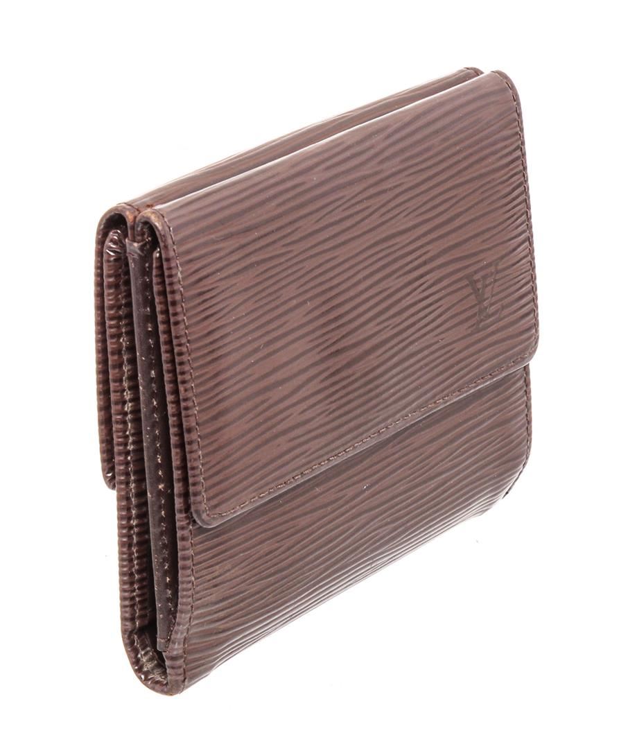 Brown Epi leather Louis Vuitton Elise compact wallet with brass hardware, embossed monogram accent at front face, single exterior pocket featuring snap closure, tonal leather lining, single bill compartment, six card slots and snap closure.