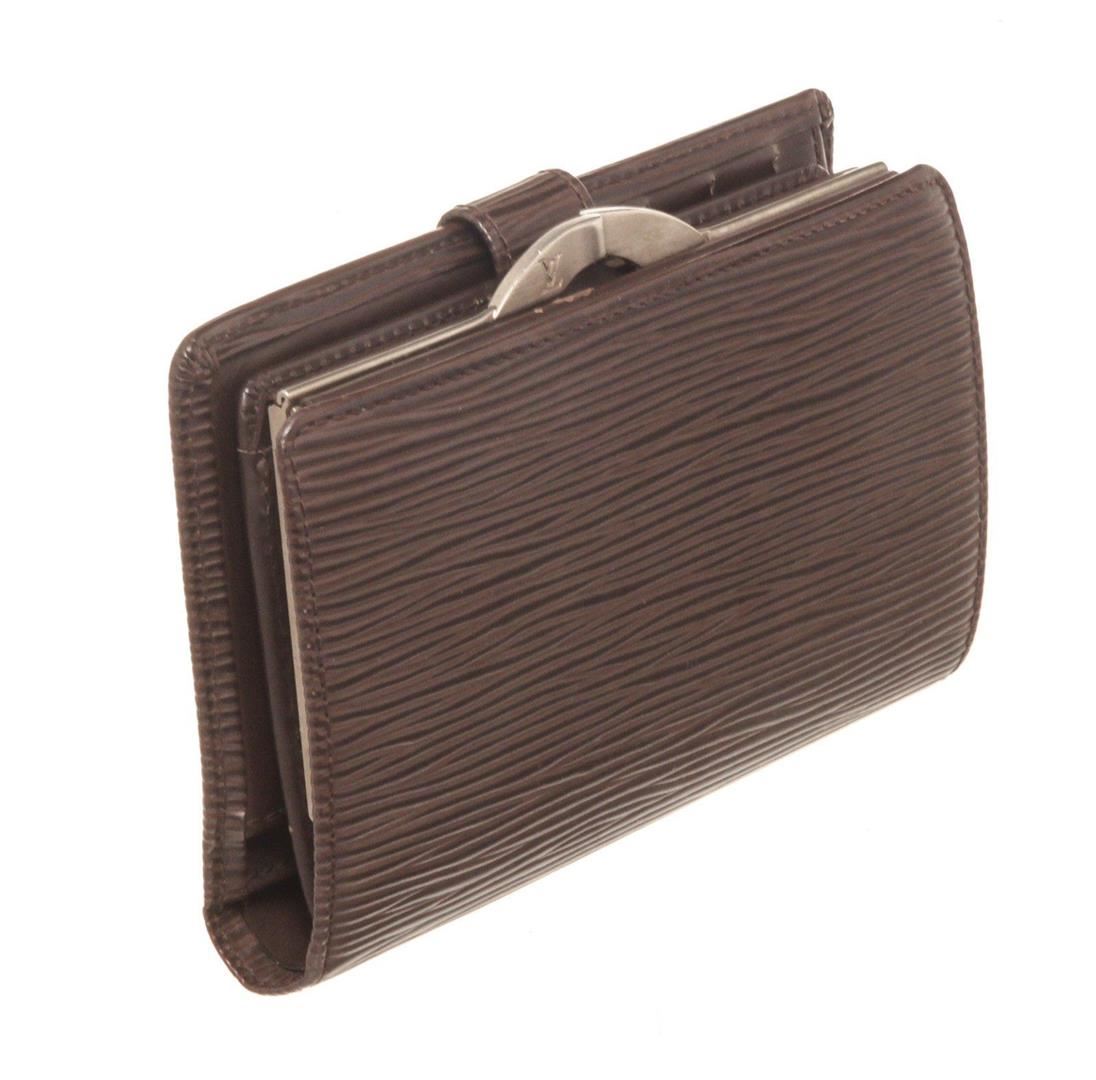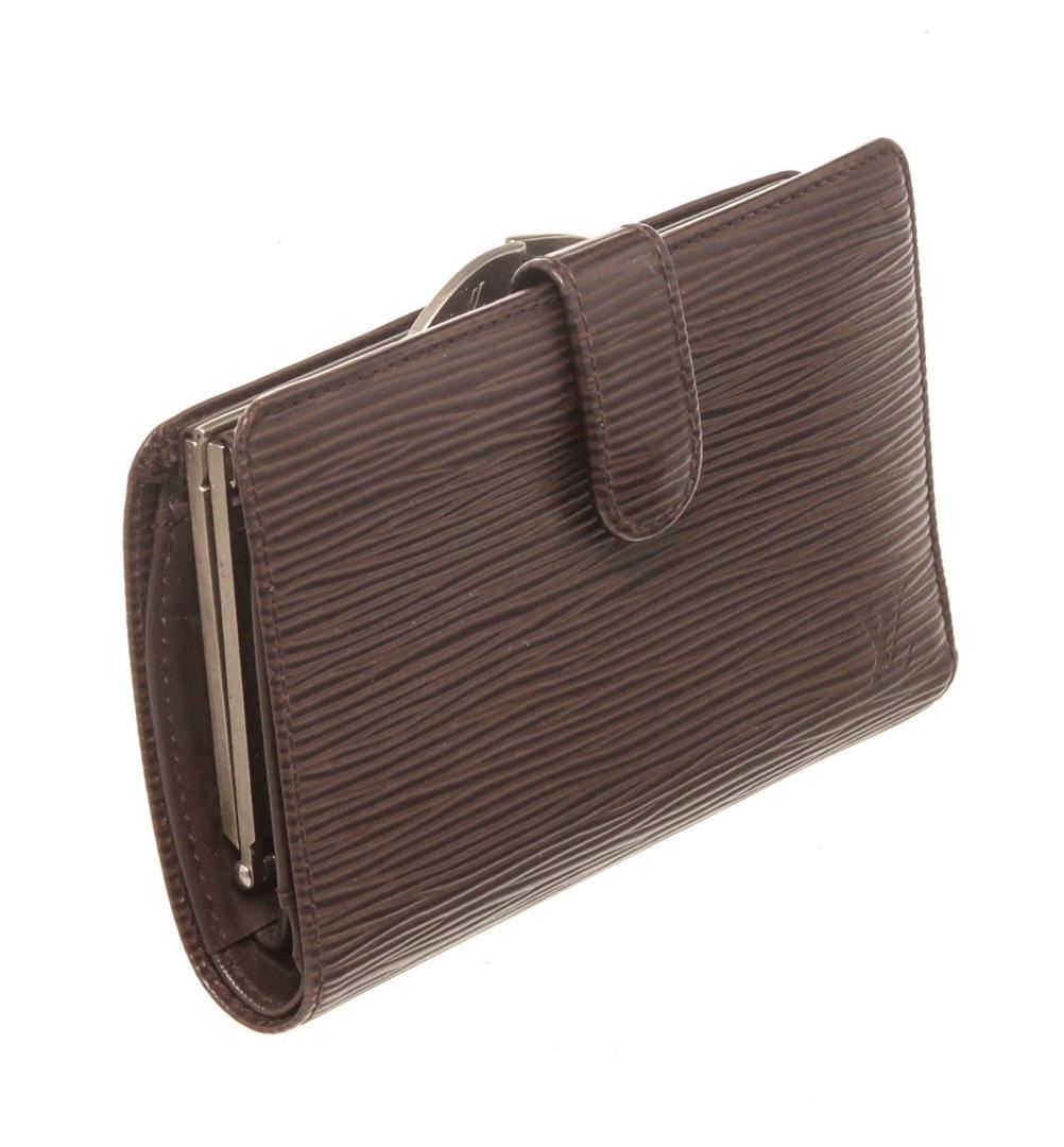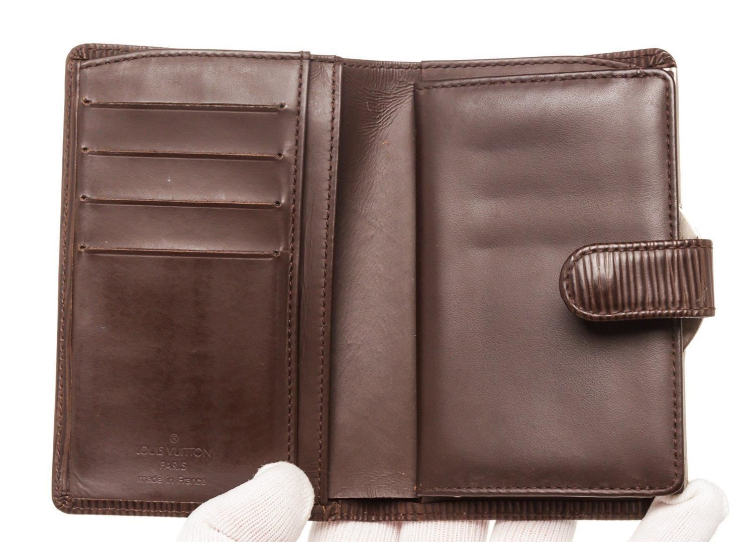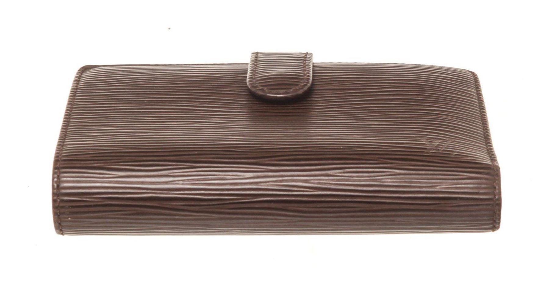 Louis Vuitton Brown Epi Leather French Walletwith gold-tone hardware, tan vachetta leather trim, single coin compartment with Kiss-lock closure, brown textured leather lining, dual slit compartments, four card slots, and snap closure at front.