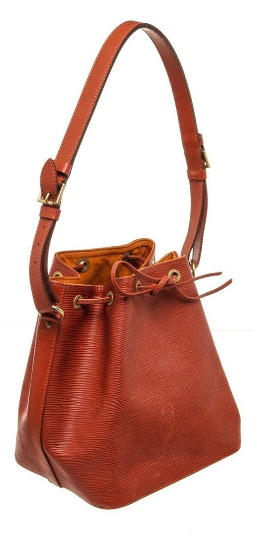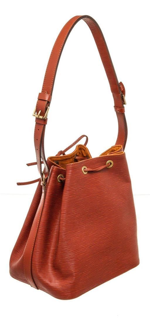 Louis Vuitton Brown Epi Leather Noe PM Bucket Bag with epi leather, gold-tone hardware, trim tan vachetta leather, shoulder adjustable strap and drawstring closure.