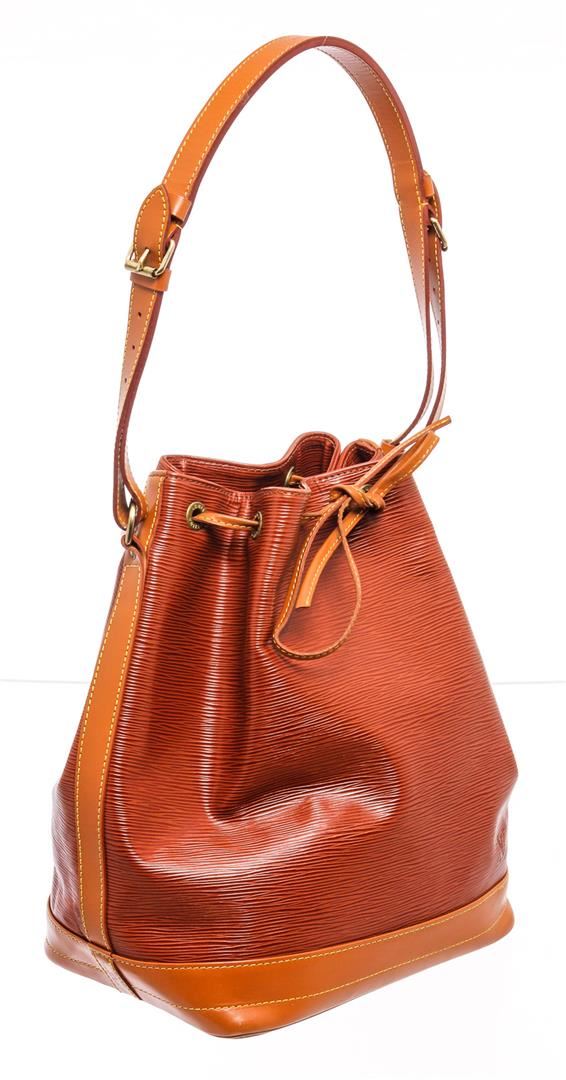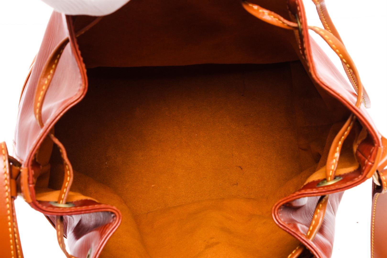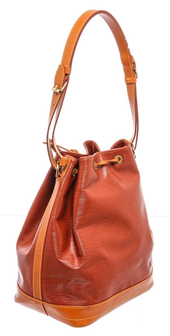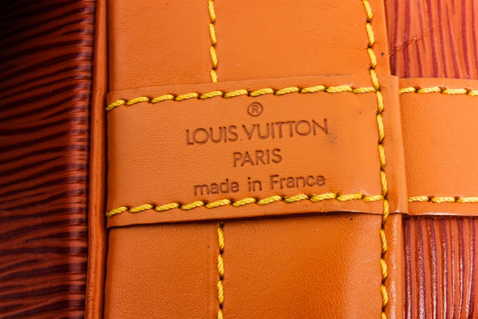Brown Epi leather Louis Vuitton Noe PM with brass hardware, adjustable flat shoulder strap, tonal Alcantara lining and drawstring closure at top.