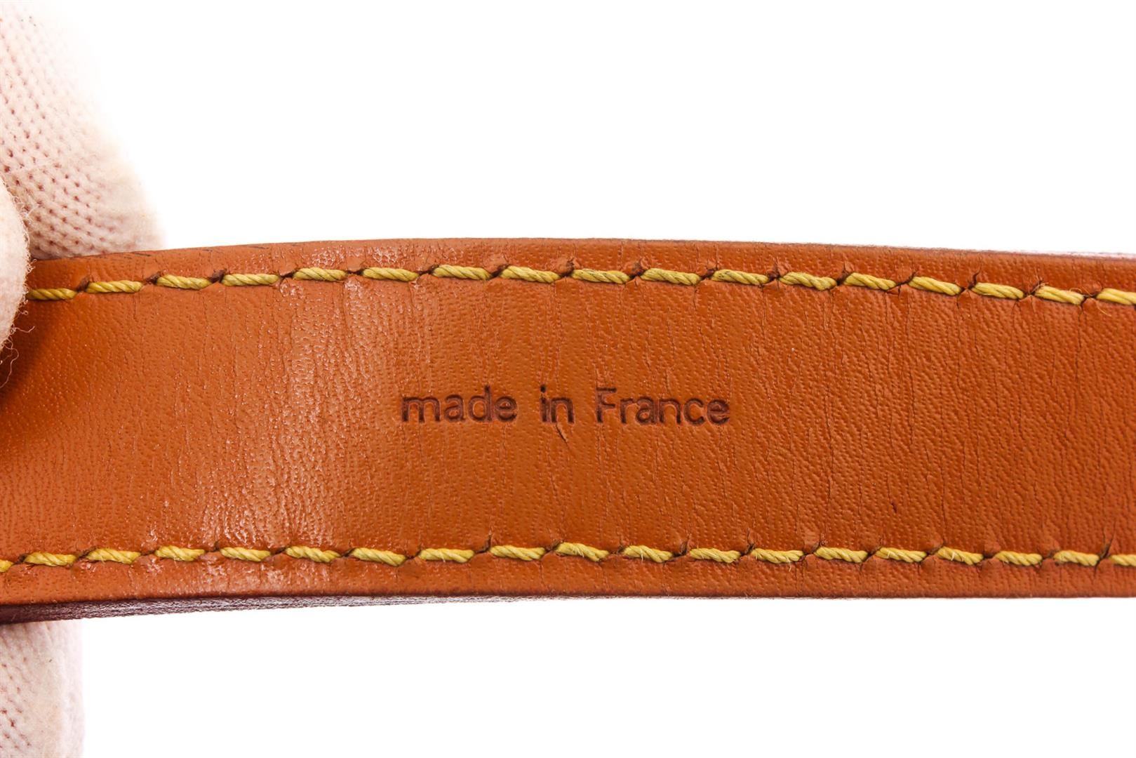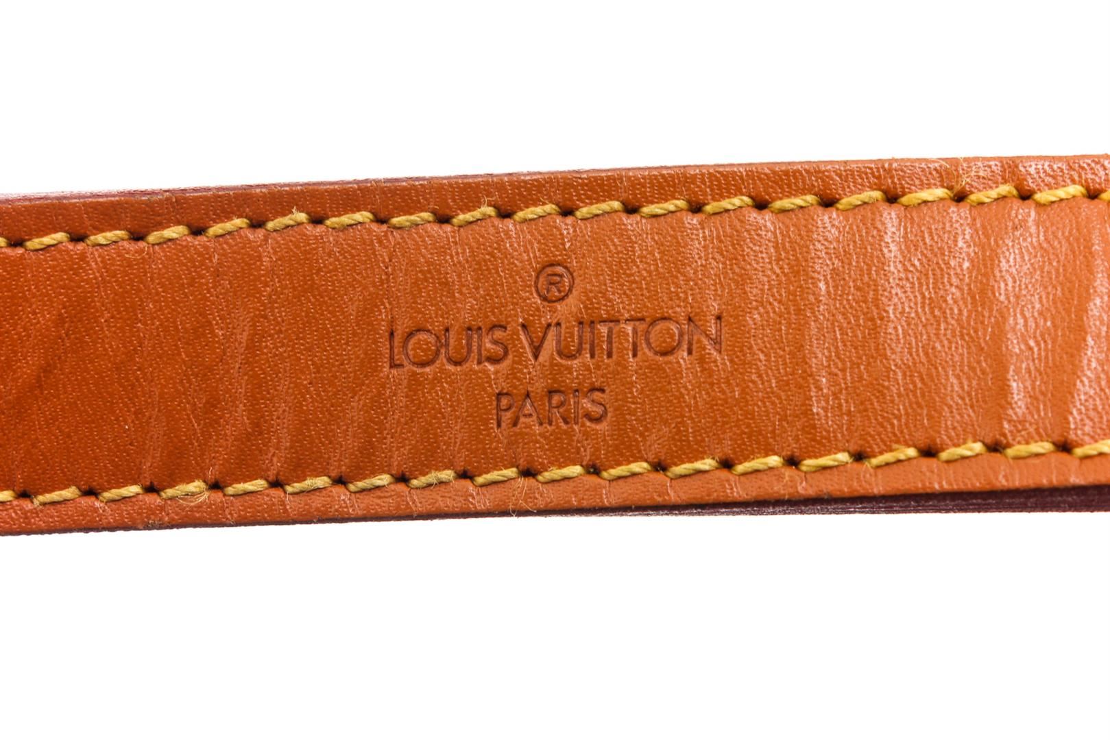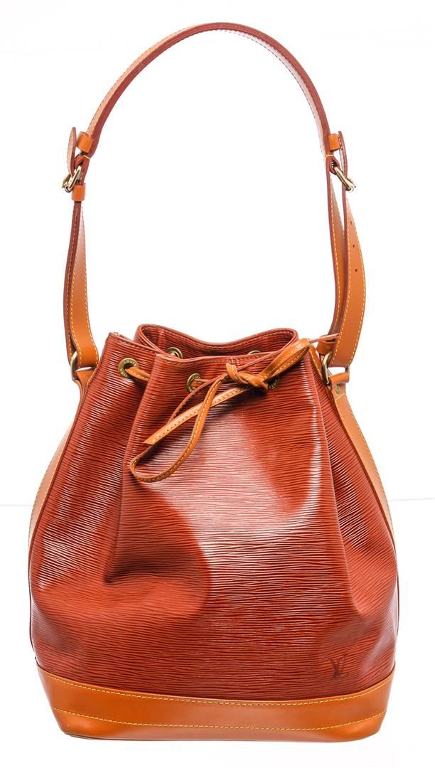 Brown Epi leather Louis Vuitton Noe PM with brass hardware, adjustable flat shoulder strap, tonal Alcantara lining and drawstring closure at top.