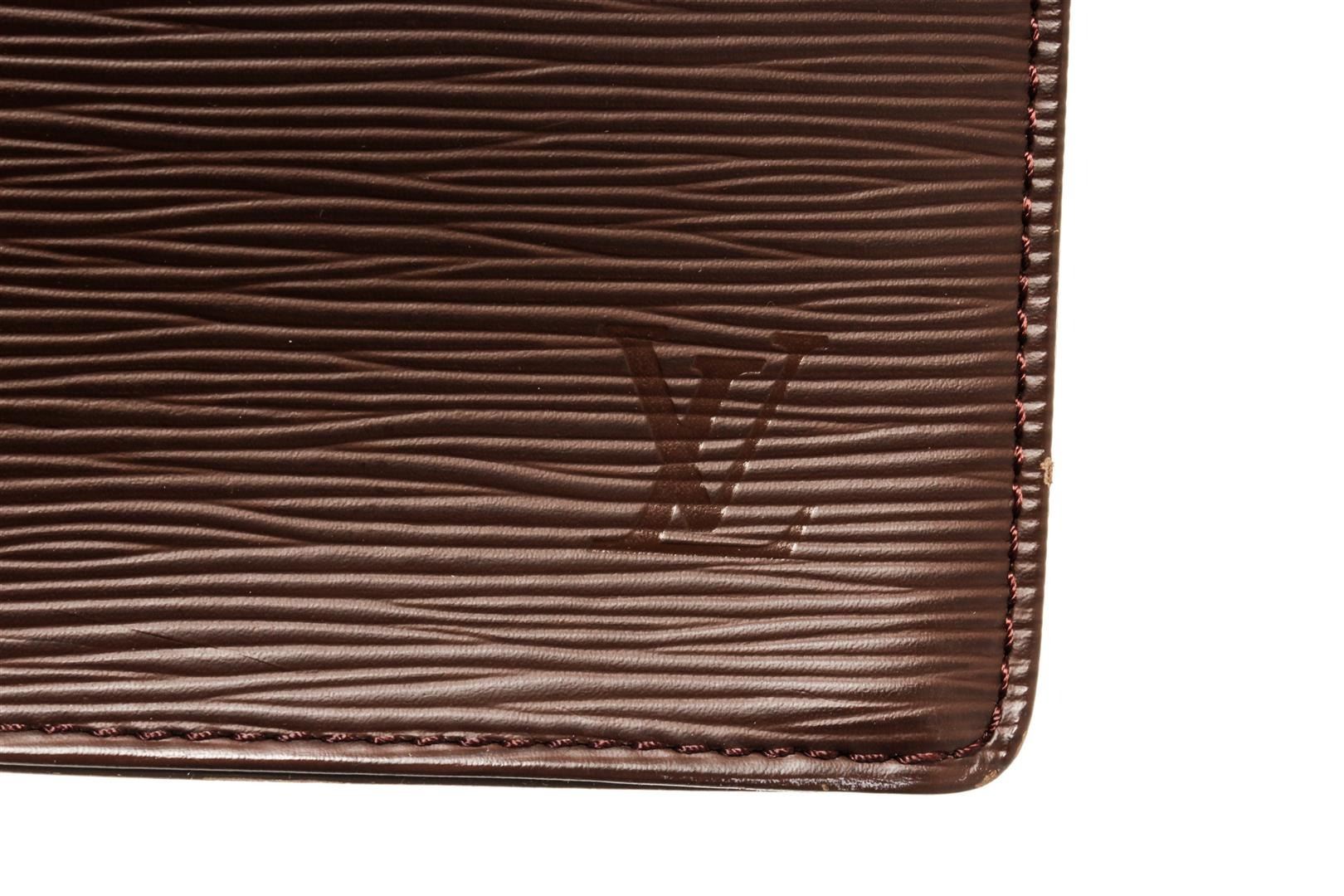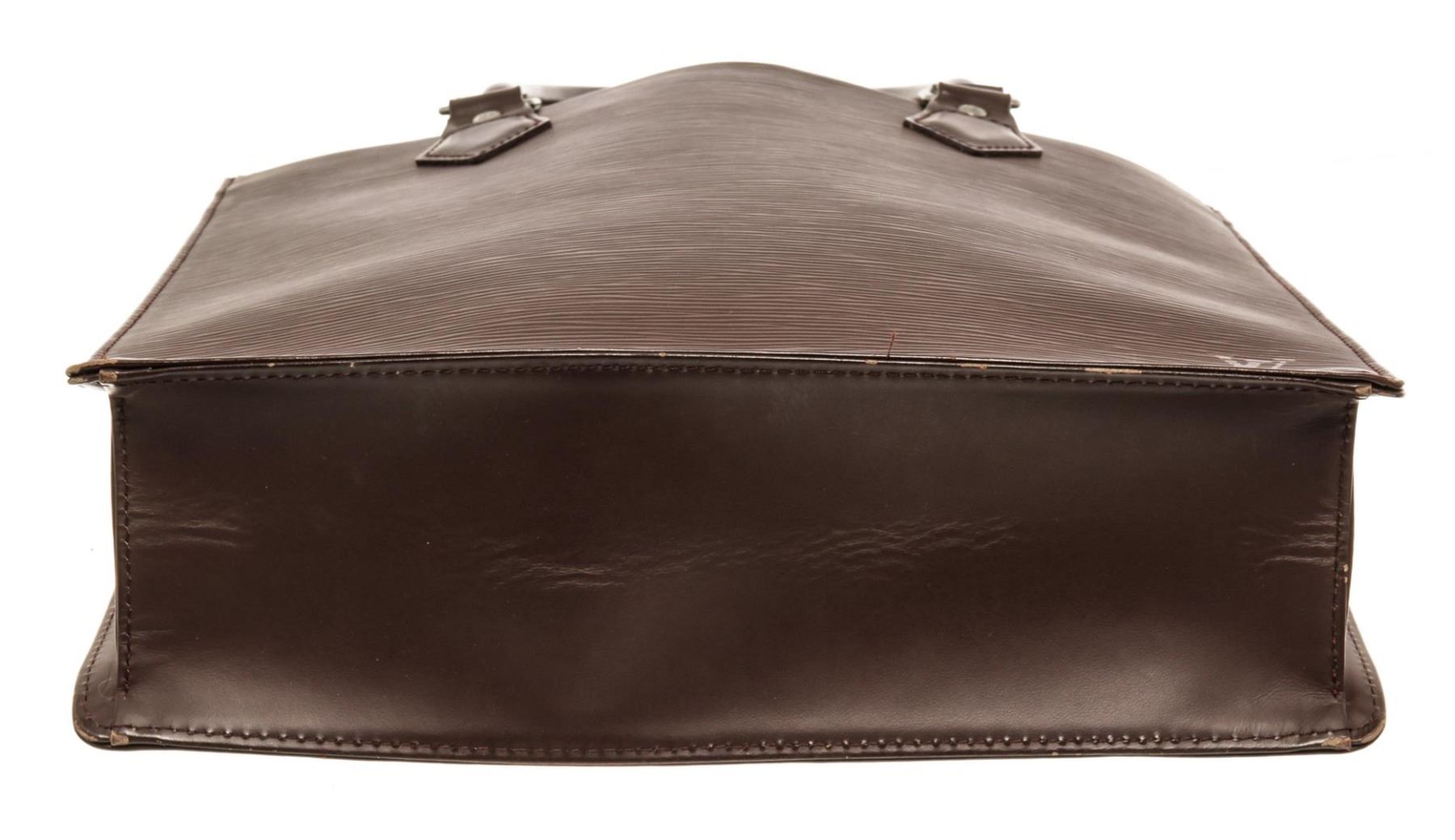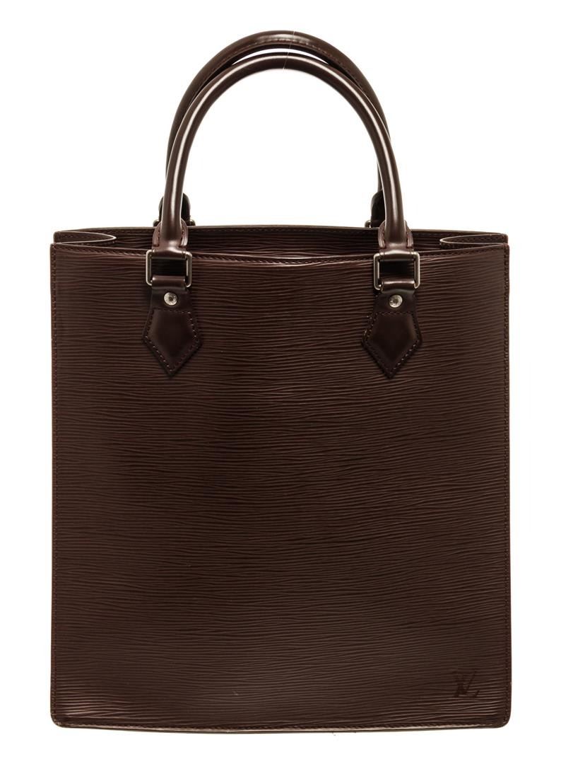 One Louis Vuitton Brown Epi Leather Sac Plat PM Tote Bag. Item is sold AS-IS. All available information is listed in the description and shown in the photo. Dark Brown epi leather Louis Vuitton Sac Plat with silver-tone hardware, dual tan rolled leather handles, dark brown canvas lining, dual interior slip pockets at interior wall and open top. .