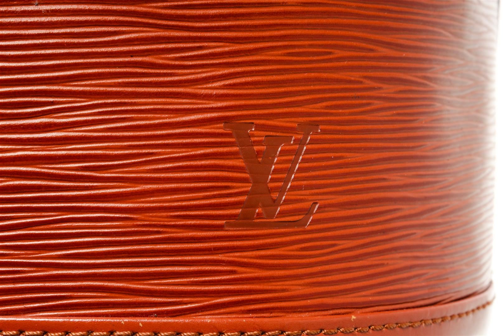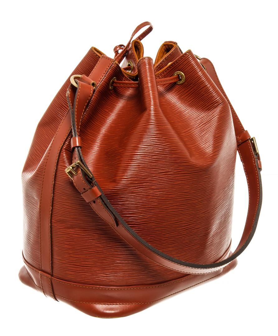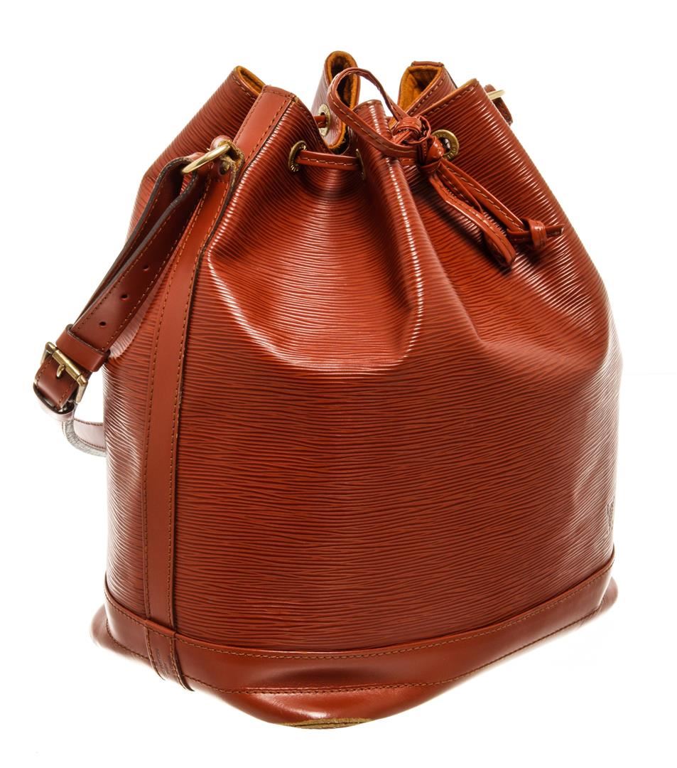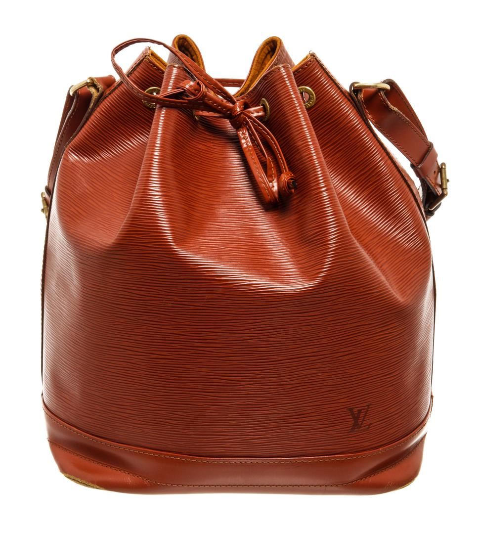 One Louis Vuitton Brown Epi Noe PM. Item is sold AS-IS. All available information is listed in the description and shown in the photo. Louis Vuitton Brown Epi Noe PM with an adjustable strap, suede lining, gold tone hardware and drawstring closure