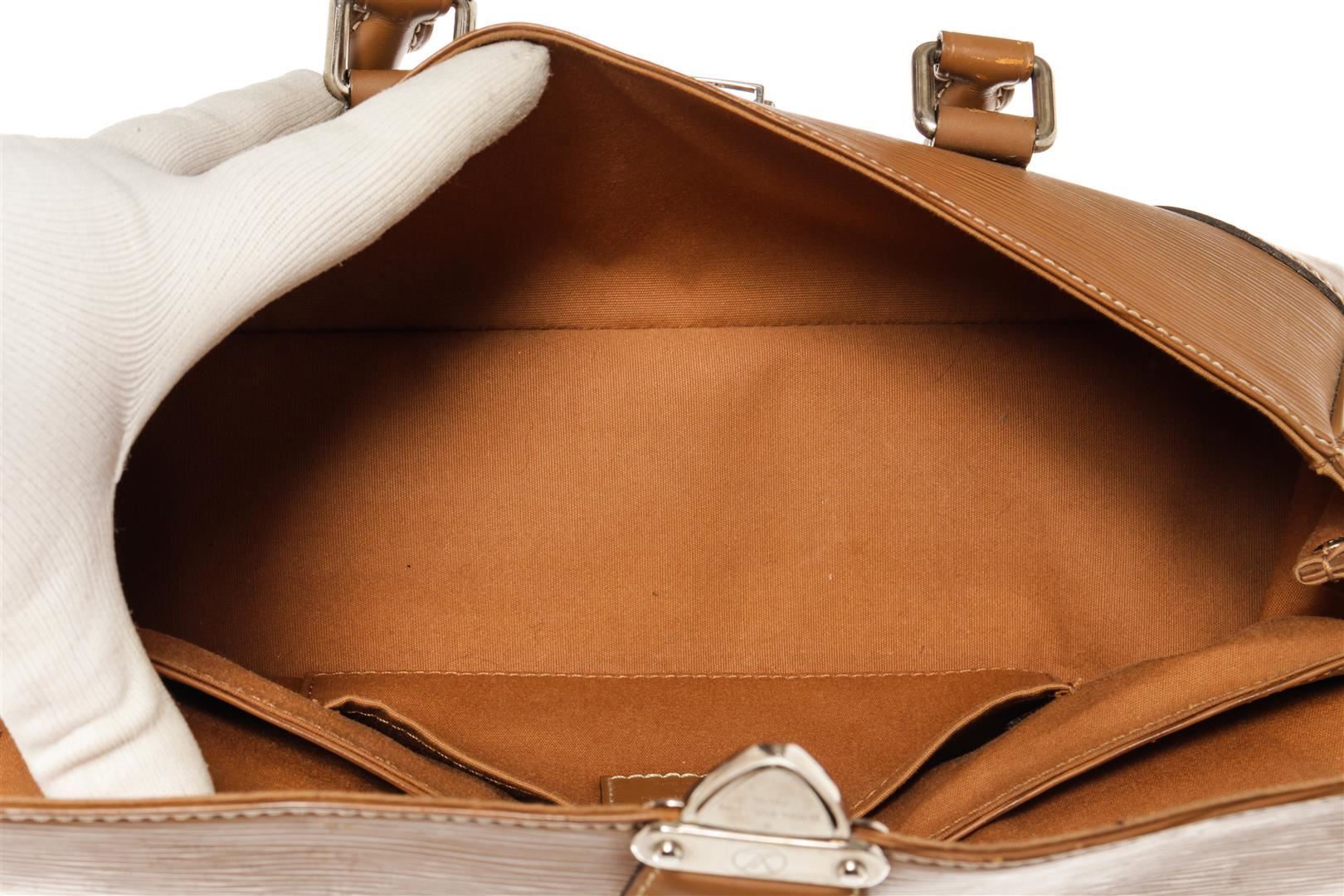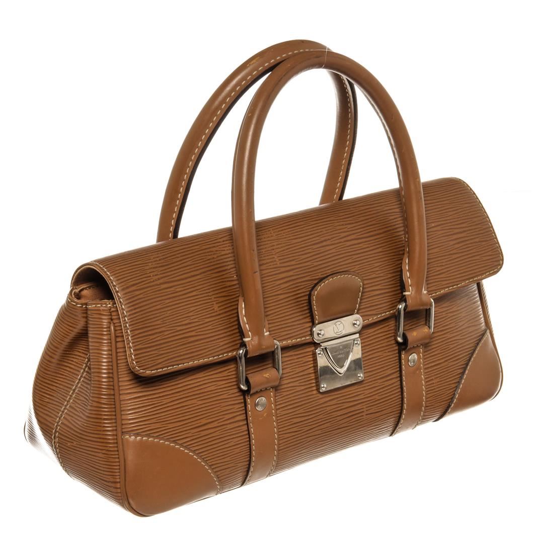 One Louis Vuitton Brown Epi Segur PM Handbag. Item is sold AS-IS. All available information is listed in the description and shown in the photo. Louis Vuitton Brown Epi Segur PM Handbag with silver-tone hardware, brown leather trim, 1 large exterior pockets, brown fabric lining, interior pockets, dual top handless, and press lock closure.