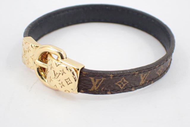 Brown Monogram coated canvas Louis Vuitton Fasten Your LV wrap bracelet features a monogram logo signature pattern and a textured gold-tone metal magnetic closure.