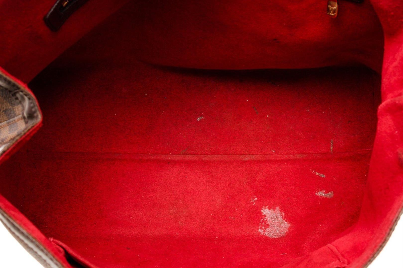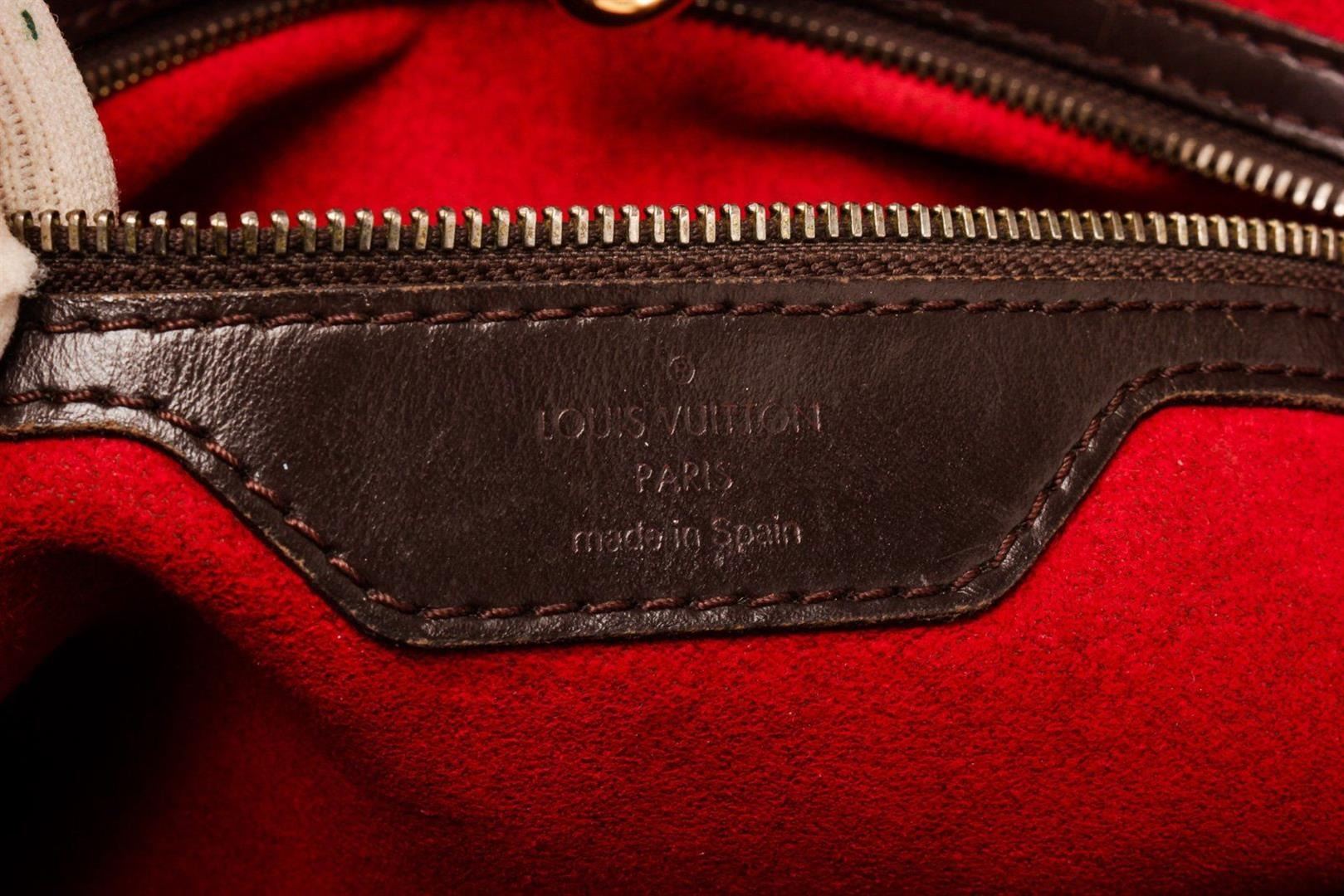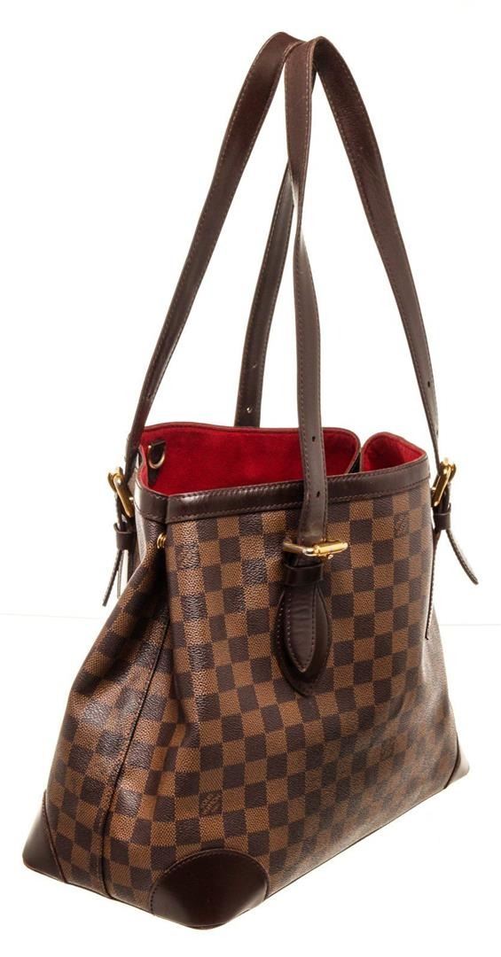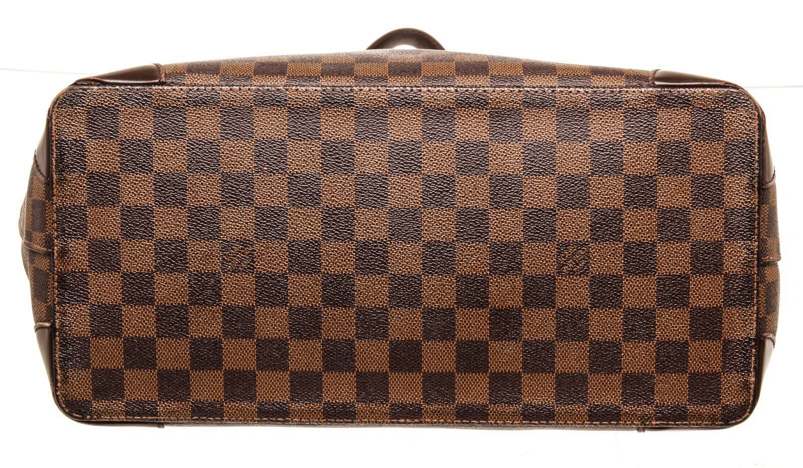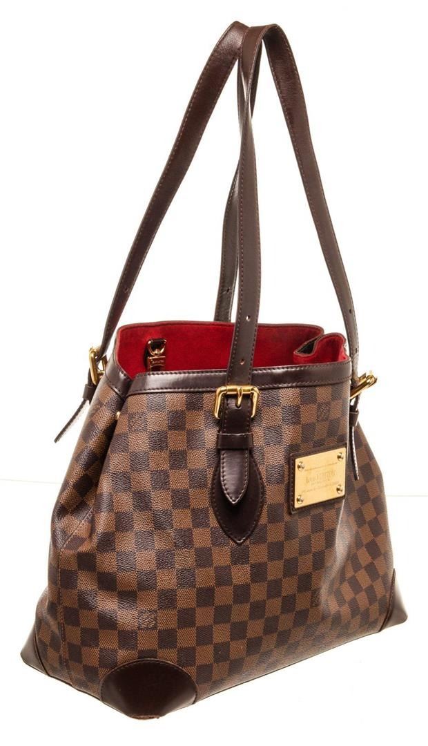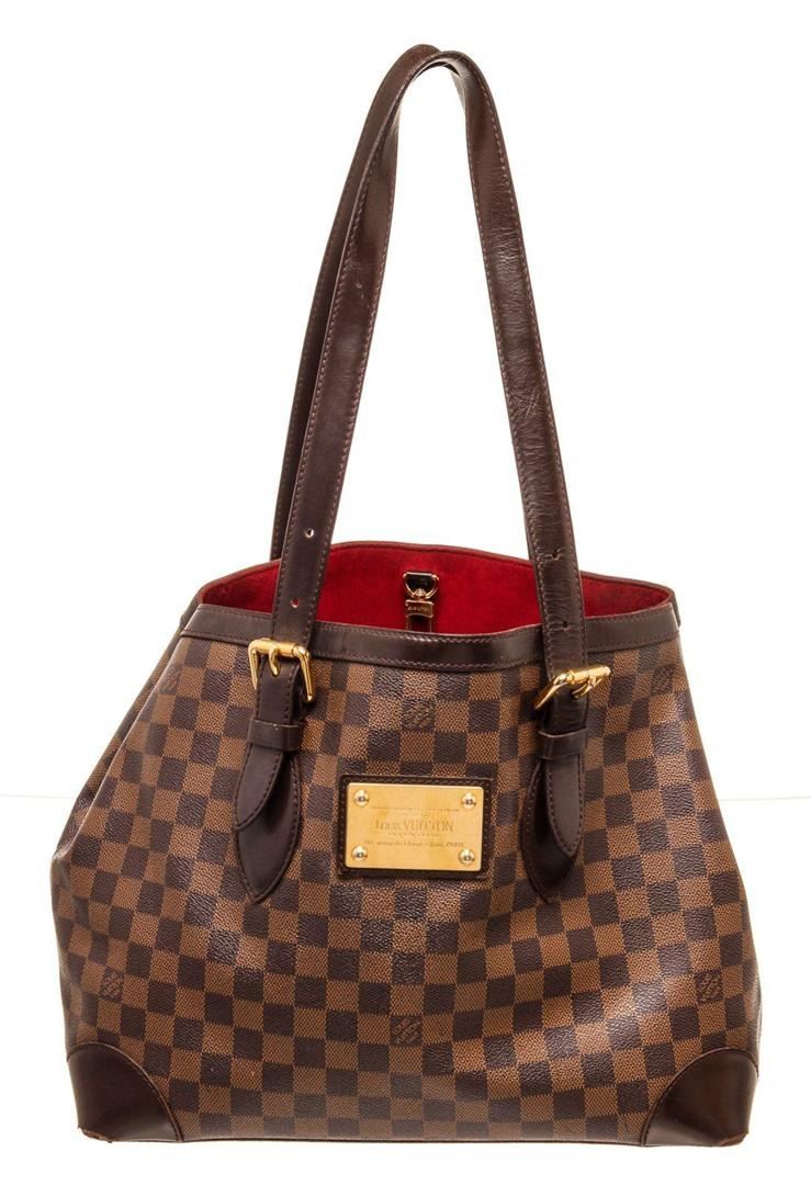 Louis Vuitton Brown Hampstead MM Tote Bag with damier canvas gold-tone hardware, trim tan vachetta leather, interior three compartments pocket, dual top handle, shoulder straps and snap closure.