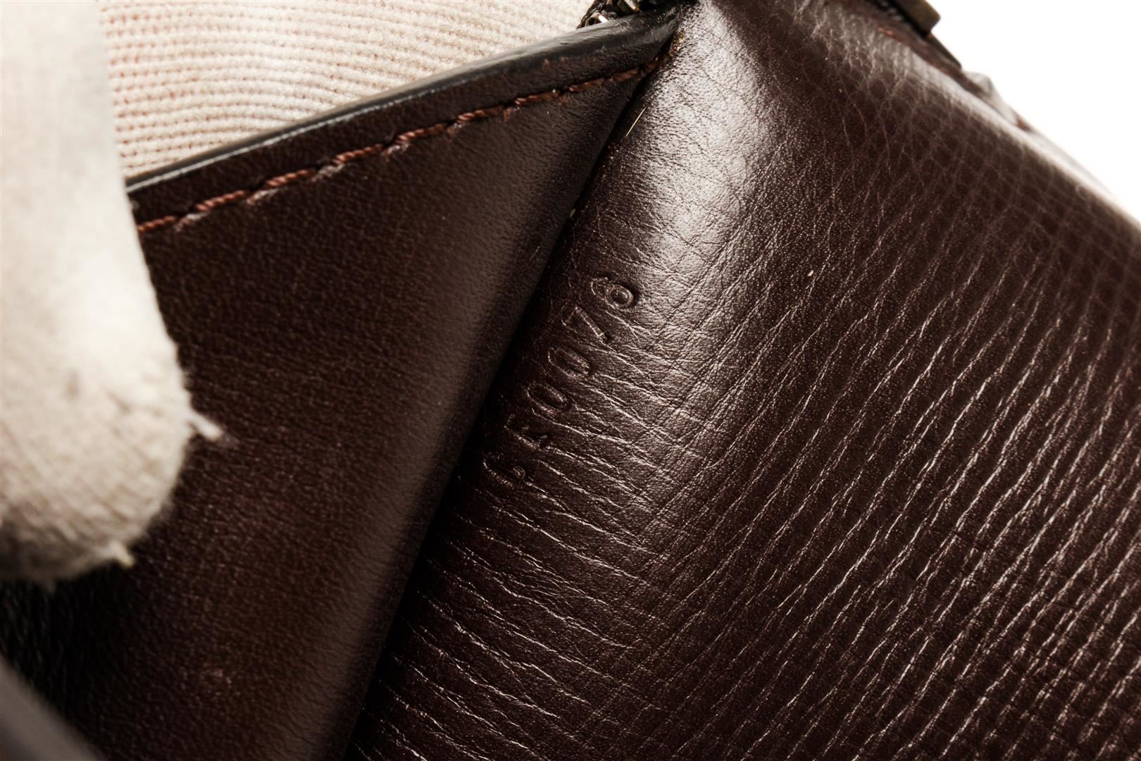 One Louis Vuitton Brown Leather Bohemerun Clutch. Item is sold AS-IS. All available information is listed in the description and shown in the photo. Louis Vuitton Brown Leather Bohemerun Clutch features gold-tone hardware, Louis Vuitton Classic Boheme Run gold-tone plaque, brown taiga leather lining, dual interior slip pockets, brown leather top handle, and zip closure.