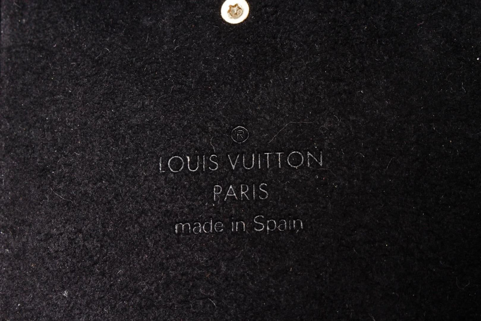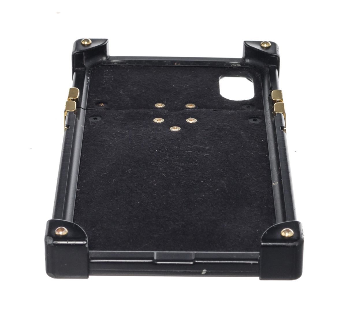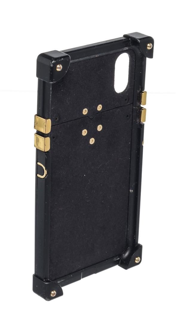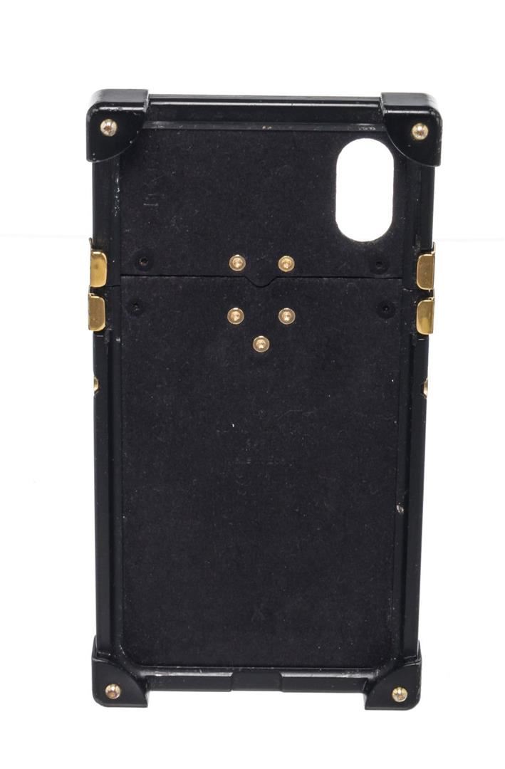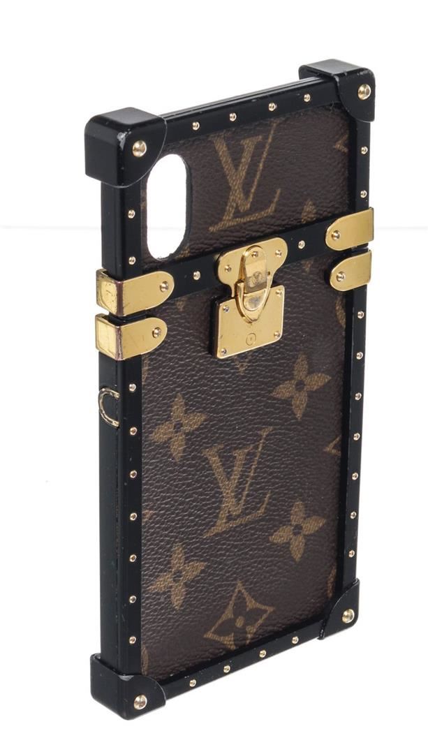 Louis Vuitton Brown Leather Eye Trunk iPhone X Case with monogram canvas, gold-tone hardware, debossed LV logo accent at front, interior slit compartment, single card slot, adhesive phone surface and bifold closure.