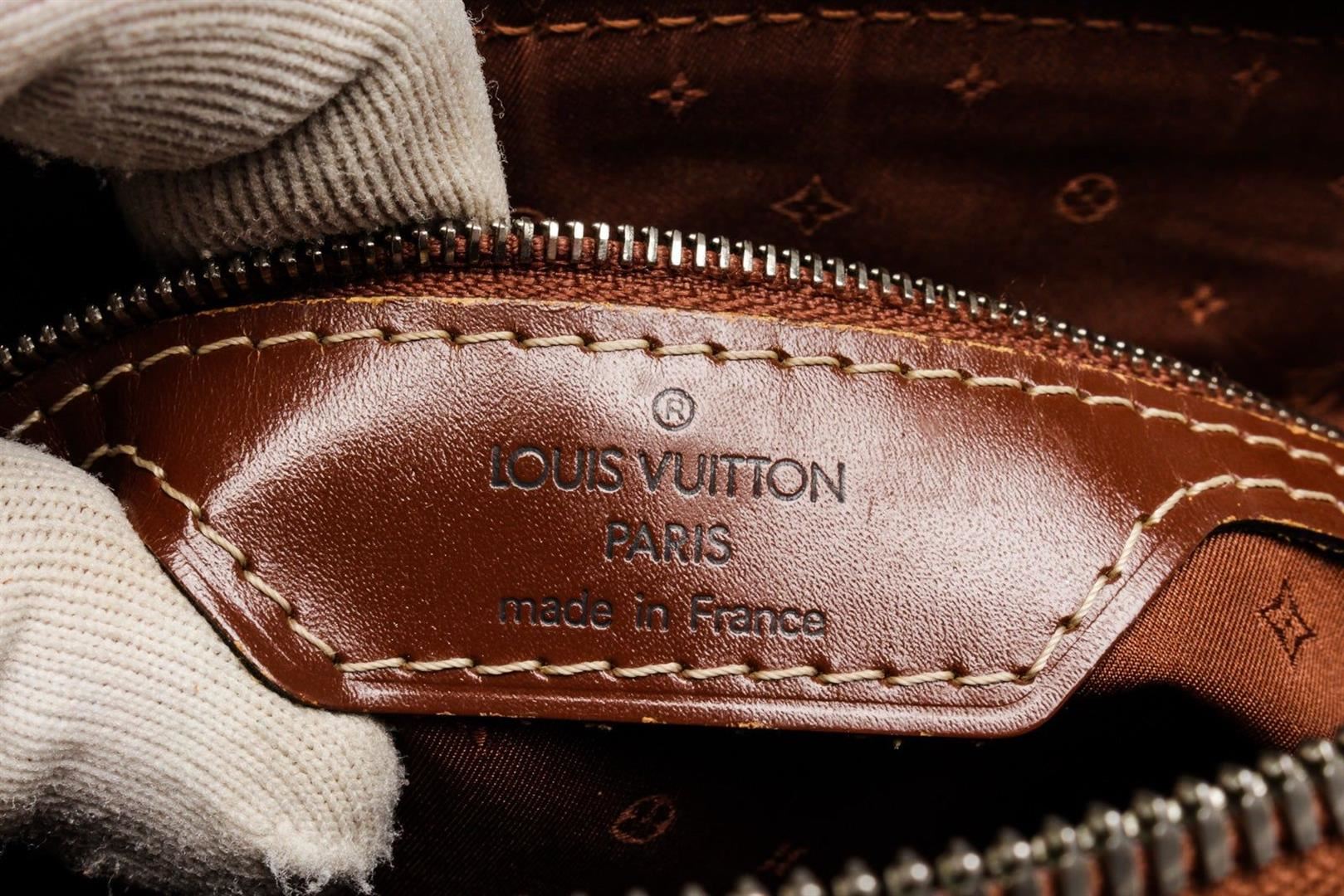 Louis Vuitton Brown Leather Lockit PM Tote Bag with leather, gold-tone hardware, leather material, tan vachetta leather trim, interior slip pocket, dual top handle, and zipper closure.