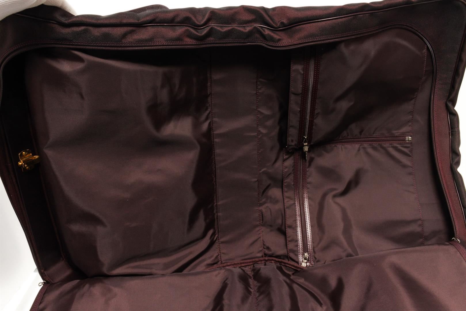 One Louis Vuitton Brown Leather Portable Garment Briefcase. Item is sold AS-IS. All available information is listed in the description and shown in the photo. Louis Vuitton Brown Leather Portable Garment Briefcase with top handle, detachable strap, top flap is leather, bottom half is canvas, two interior zip pockets, comes with a hanger, gold tone hardware, buckle and zip closure.