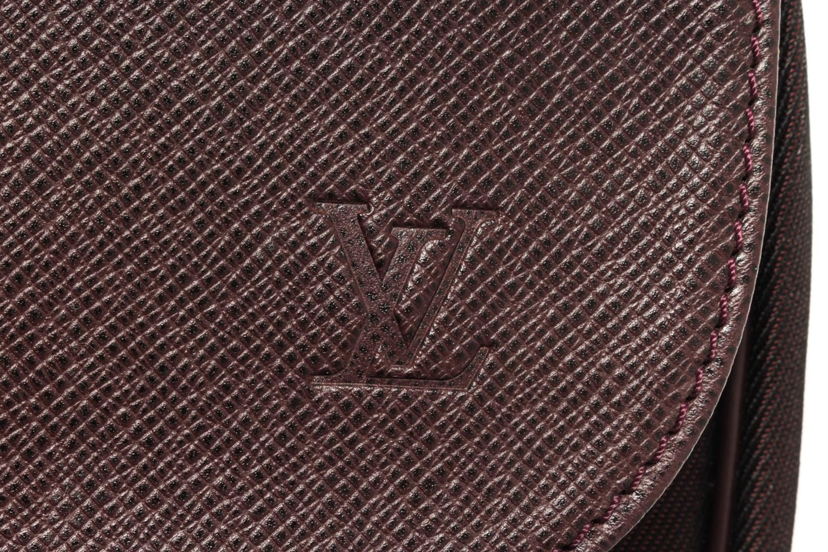 One Louis Vuitton Brown Leather Portable Garment Briefcase. Item is sold AS-IS. All available information is listed in the description and shown in the photo. Louis Vuitton Brown Leather Portable Garment Briefcase with top handle, detachable strap, top flap is leather, bottom half is canvas, two interior zip pockets, comes with a hanger, gold tone hardware, buckle and zip closure.