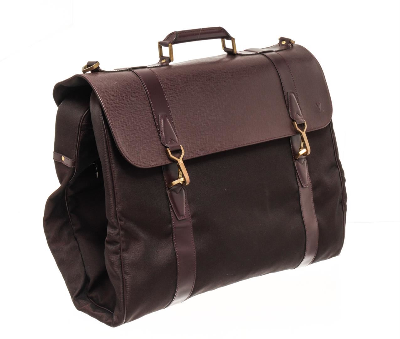 One Louis Vuitton Brown Leather Portable Garment Briefcase. Item is sold AS-IS. All available information is listed in the description and shown in the photo. Louis Vuitton Brown Leather Portable Garment Briefcase with top handle, detachable strap, top flap is leather, bottom half is canvas, two interior zip pockets, comes with a hanger, gold tone hardware, buckle and zip closure.
