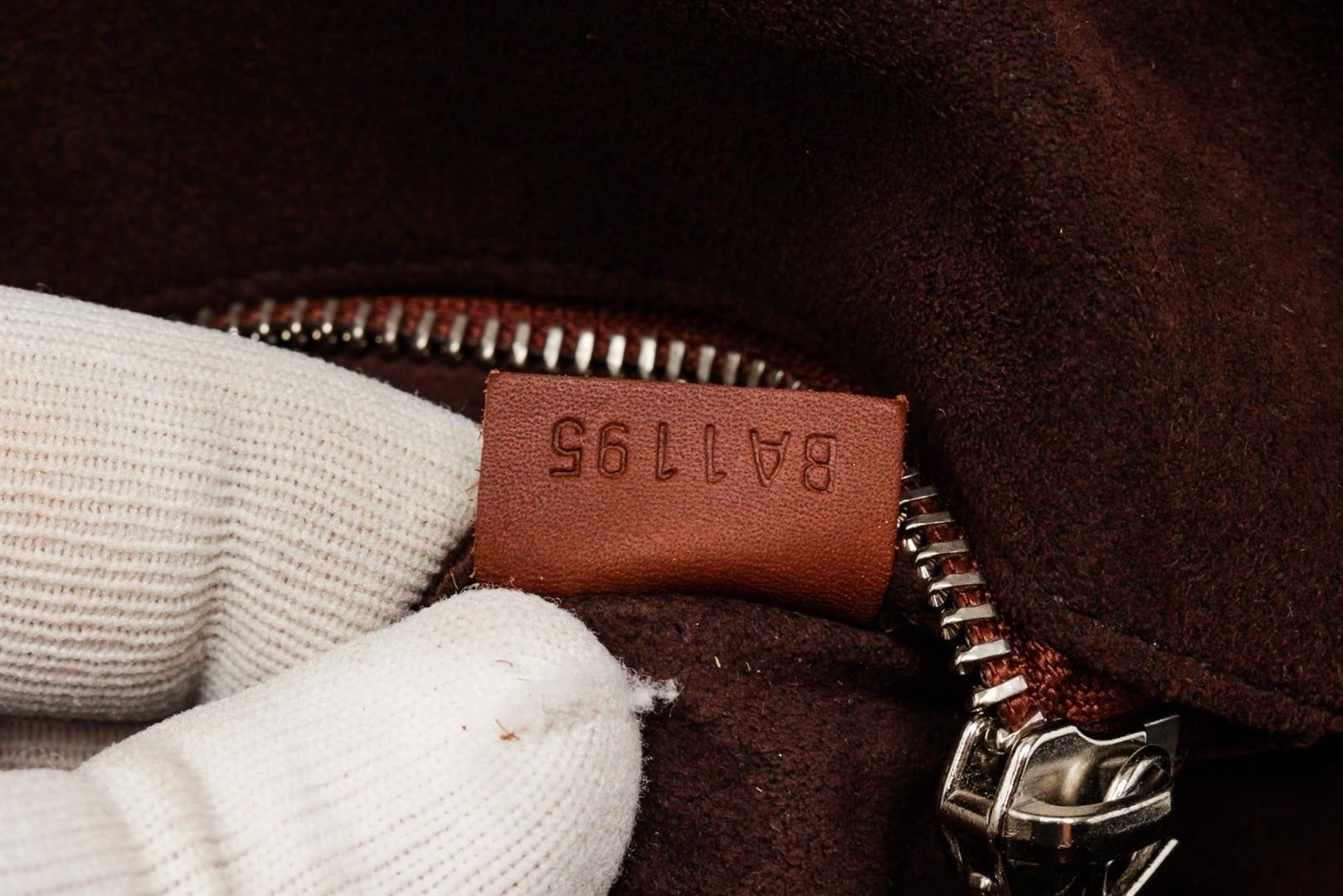 Louis Vuitton Brown Leather Porte Documents Voyage Briefcase Bag with gold-tone hardware, black leather trim, dual rolled top handles, black canvas lining, single interior compartment featuring two pen slots and seven pockets; one featuring zip closure and two-way zip closure at top.