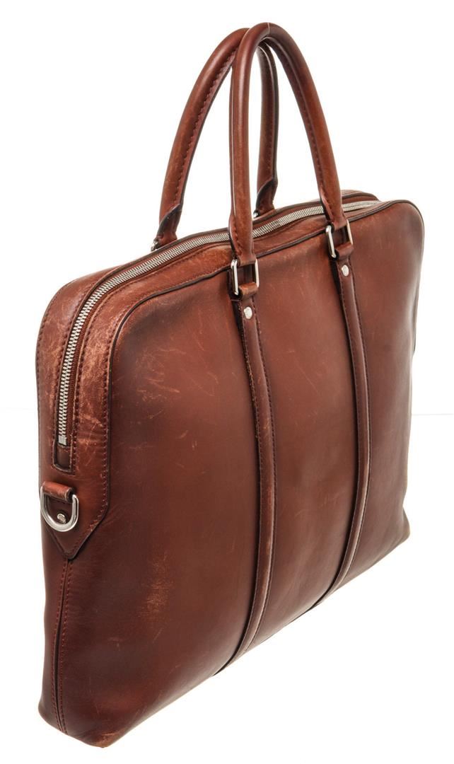 Louis Vuitton Brown Leather Porte Documents Voyage Briefcase Bag. Please see photos and description for all available information! Louis Vuitton Brown Leather Porte Documents Voyage Briefcase Bag with gold-tone hardware, black leather trim, dual rolled to