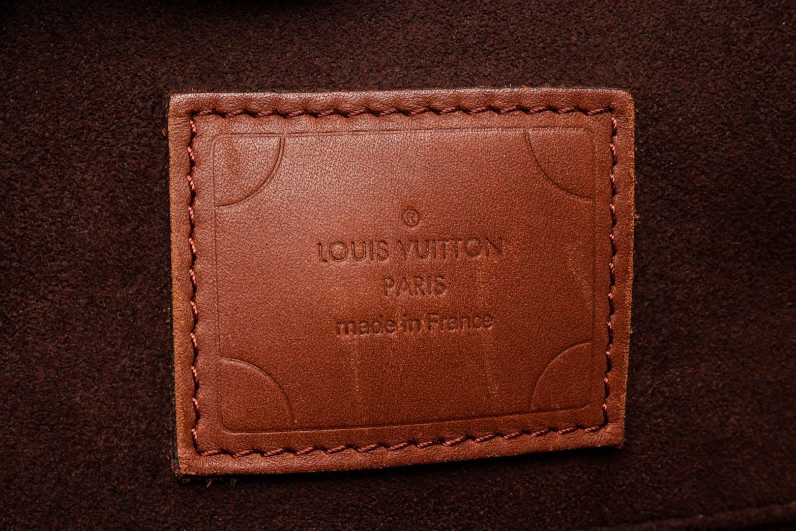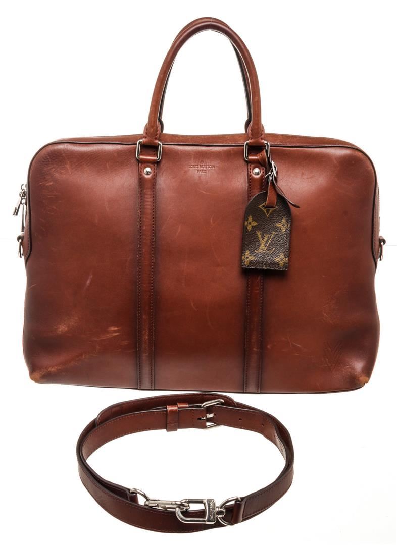 One Louis Vuitton Brown Leather Porte Documents Voyage Briefcase Bag. Item is sold AS-IS. All available information is listed in the description and shown in the photo. Louis Vuitton Brown Leather Porte Documents Voyage Briefcase Bag with gold-tone hardware, black leather trim, dual rolled top handles, black canvas lining, single interior compartment featuring two pen slots and seven pockets; one featuring zip closure and two-way zip closure at top.