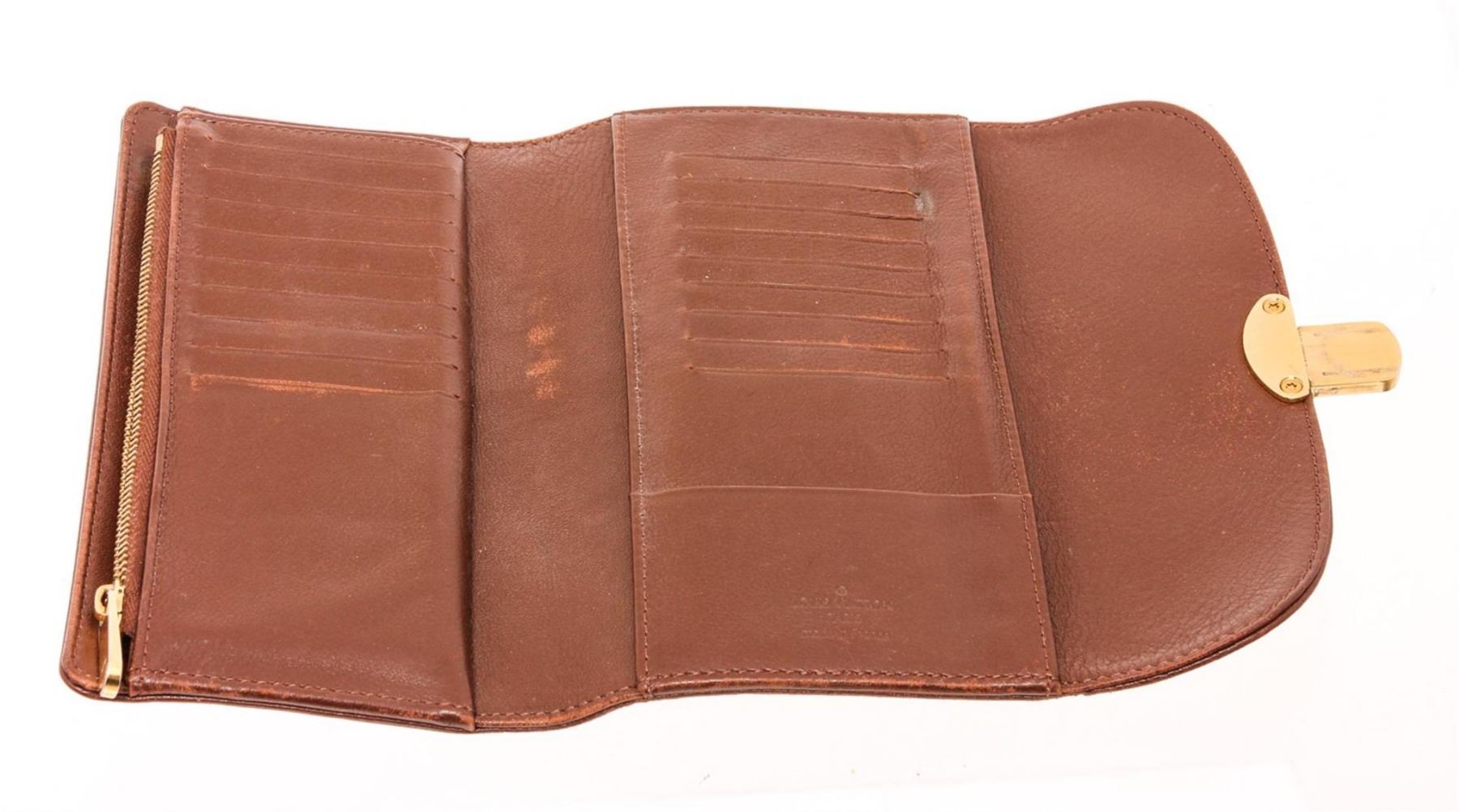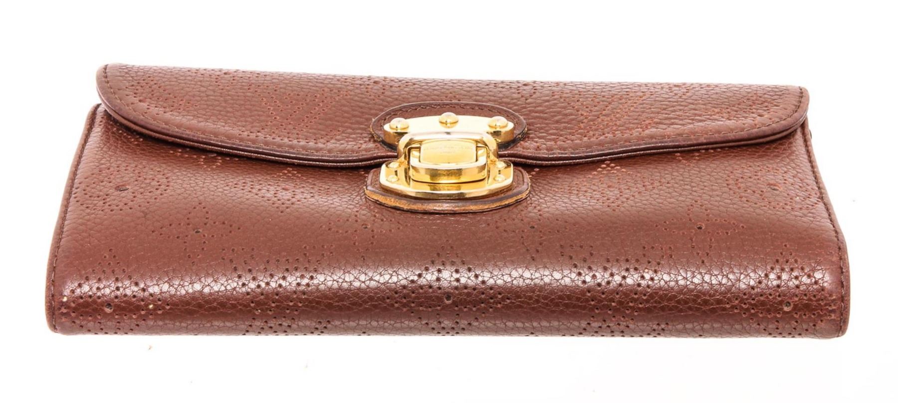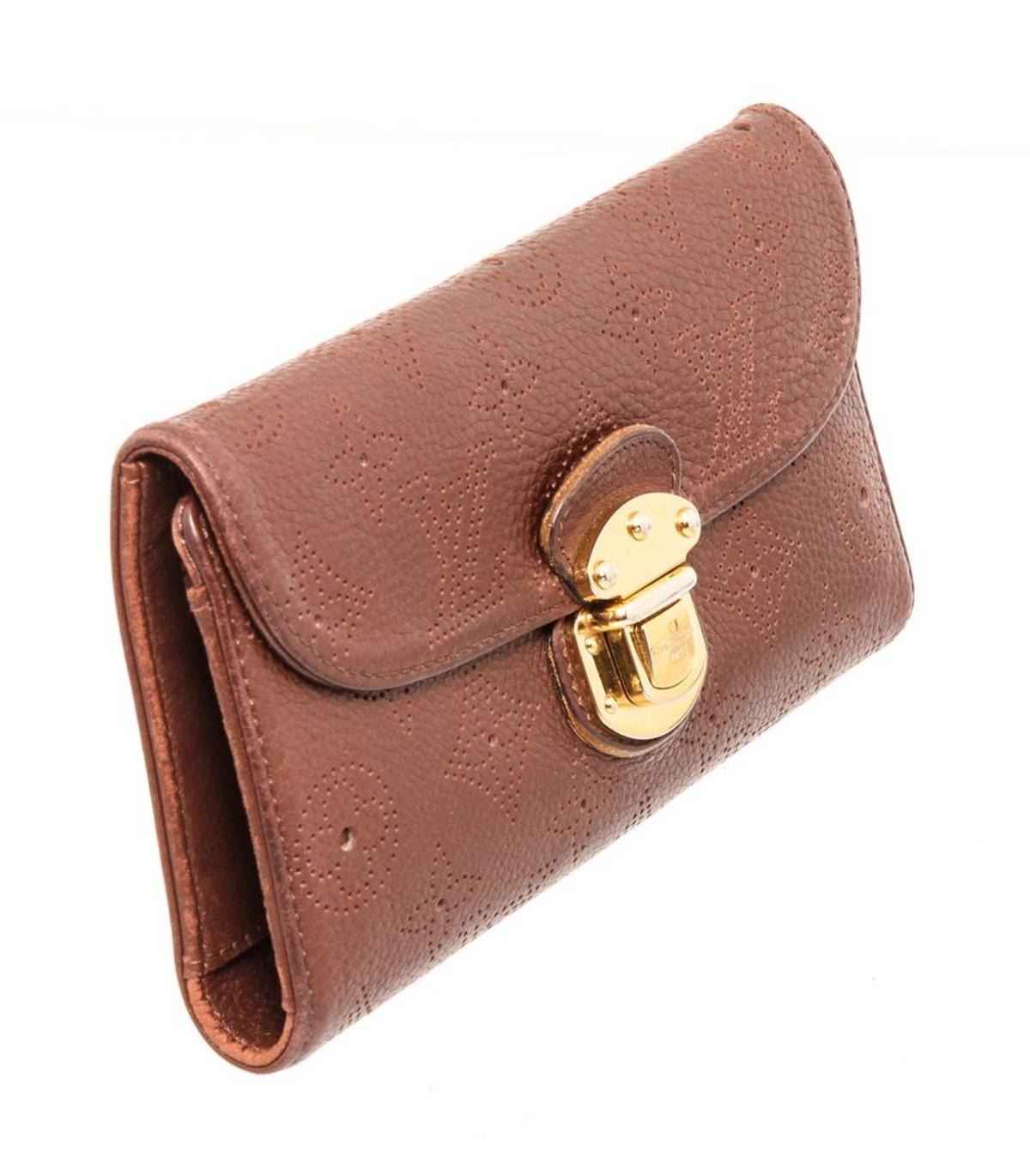 Brown Monogram Mahina leather Louis Vuitton Amelia wallet with brass hardware, tonal leather interior, dual compartments; one with zip closure, three bill compartments, nineteen card slots and push-lock closure at front flap.