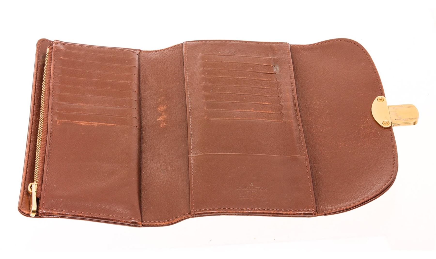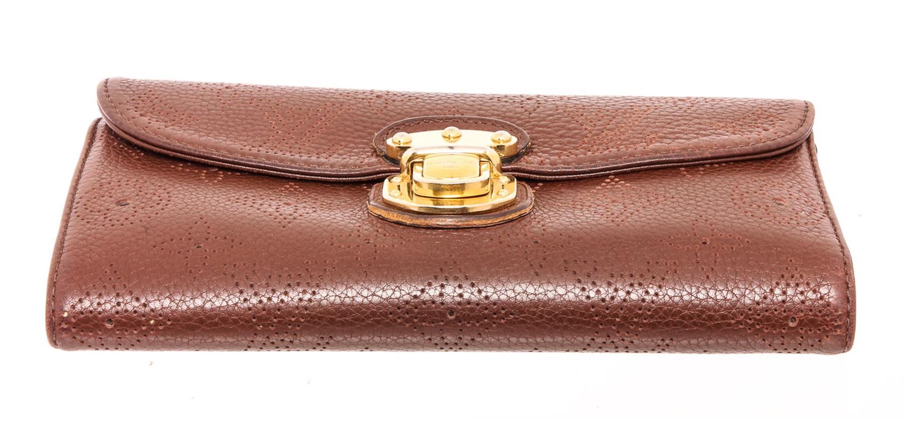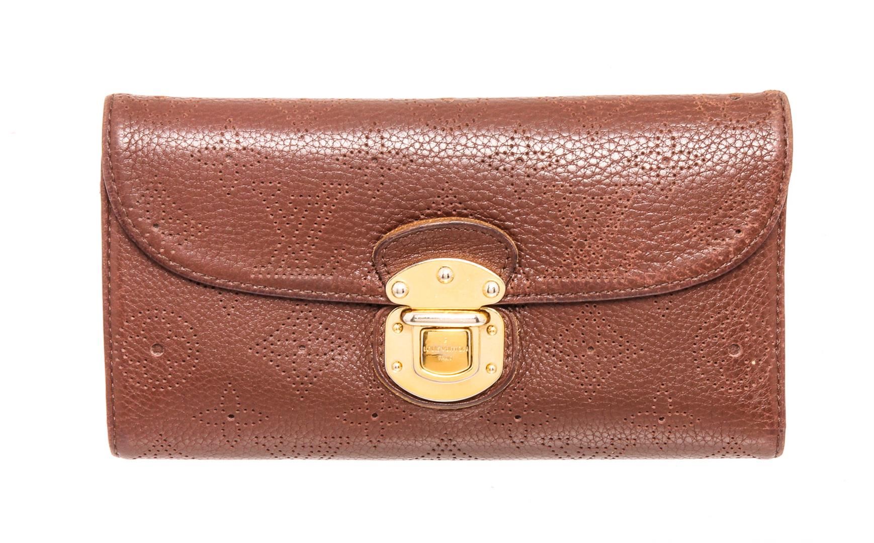 Brown Monogram Mahina leather Louis Vuitton Amelia wallet with brass hardware, tonal leather interior, dual compartments; one with zip closure, three bill compartments, nineteen card slots and push-lock closure at front flap.