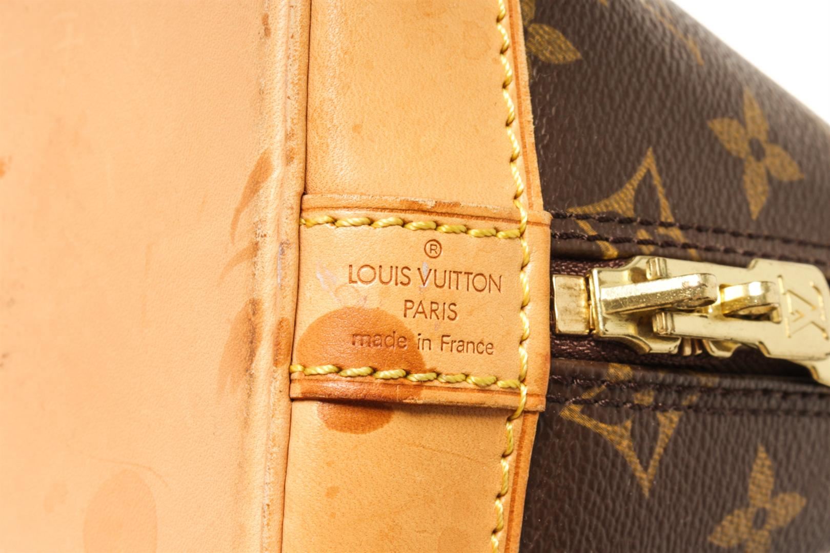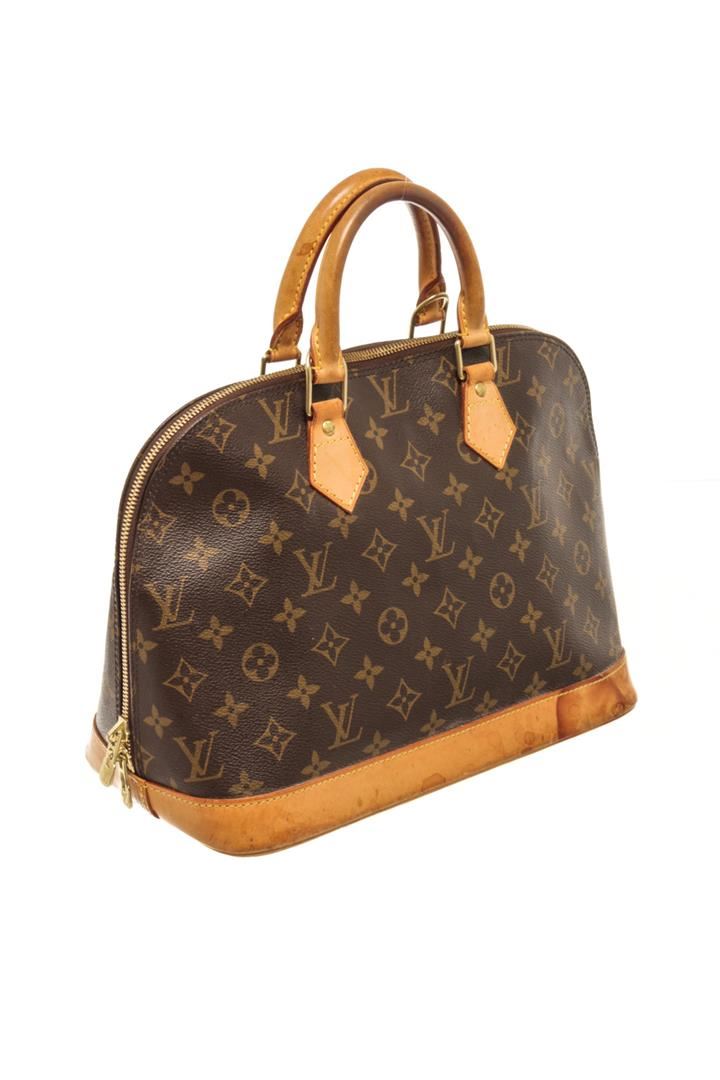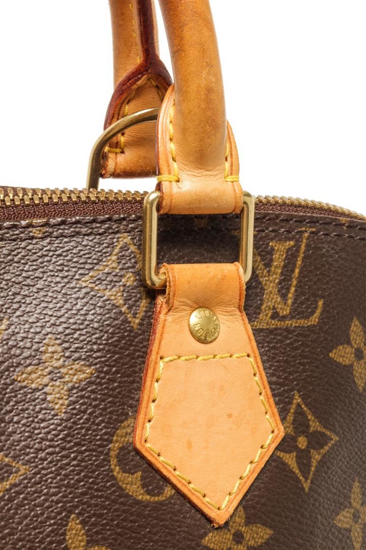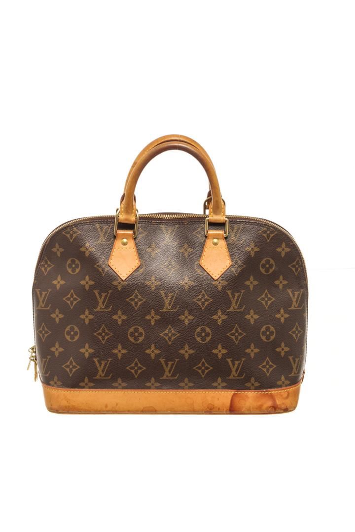 One Louis Vuitton Brown Monogram Alma Bag. Item is sold AS-IS. All available information is listed in the description and shown in the photo. Louis Vuitton Brown Monogram Alma PM Bag with top handle, canvas lining, interior slip pockets, gold tone hardware, zipper closure. There is heavy wear on the bottom of the bag. Please refer to photos. Height: 9.1" Width: 13.4" Depth: 6.1" , Handle Drop: / 23.11 x 34.03 x 15.49 Cm