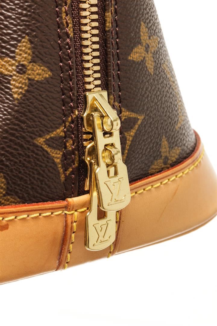 One Louis Vuitton Brown Monogram Alma PM Bag. Item is sold AS-IS. All available information is listed in the description and shown in the photo. Louis Vuitton Brown Monogram Alma PM Bag with top handle, canvas lining, interior slip pockets, gold tone hardware, zipper closure. There is some wear on the bottom of the bag. Height: 8.9" Width: 12.2" Depth: 5.9", Handle Drop: 3.1" / 22.60 x 30.98 x 14.98 Cm