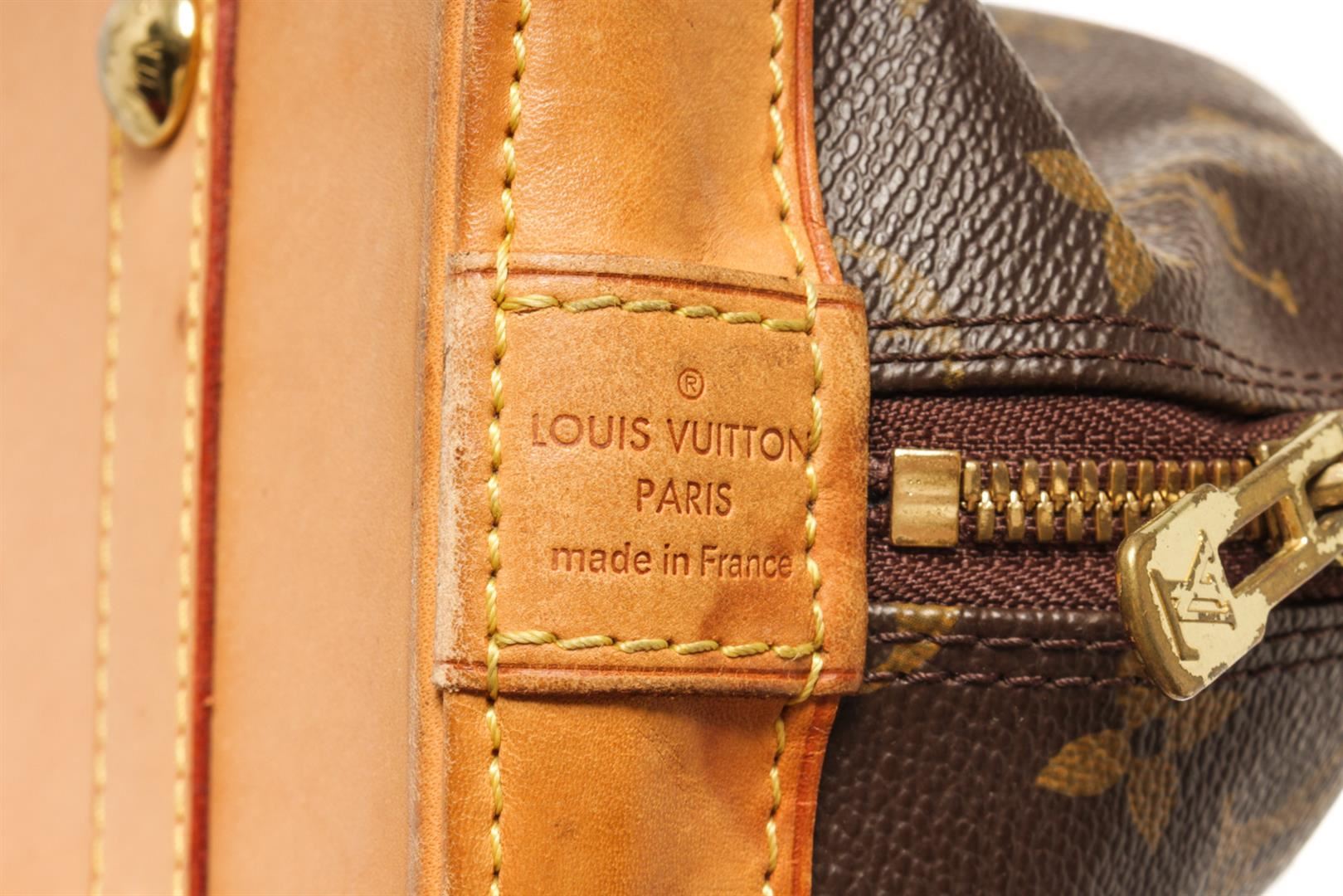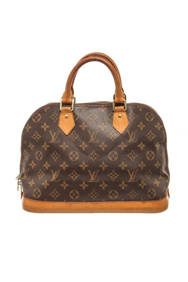 One Louis Vuitton Brown Monogram Alma PM Bag. Item is sold AS-IS. All available information is listed in the description and shown in the photo. Louis Vuitton Brown Monogram Alma PM Bag with top handle, canvas lining, interior slip pockets, gold tone hardware, zipper closure. There is some wear on the bottom of the bag and handles. Please refer to photos. Height: 9.1" Width: 14.2" Depth: 6.1", Handle Drop: 3.1" / 23.11 x 36.06 x 15.49 Cm