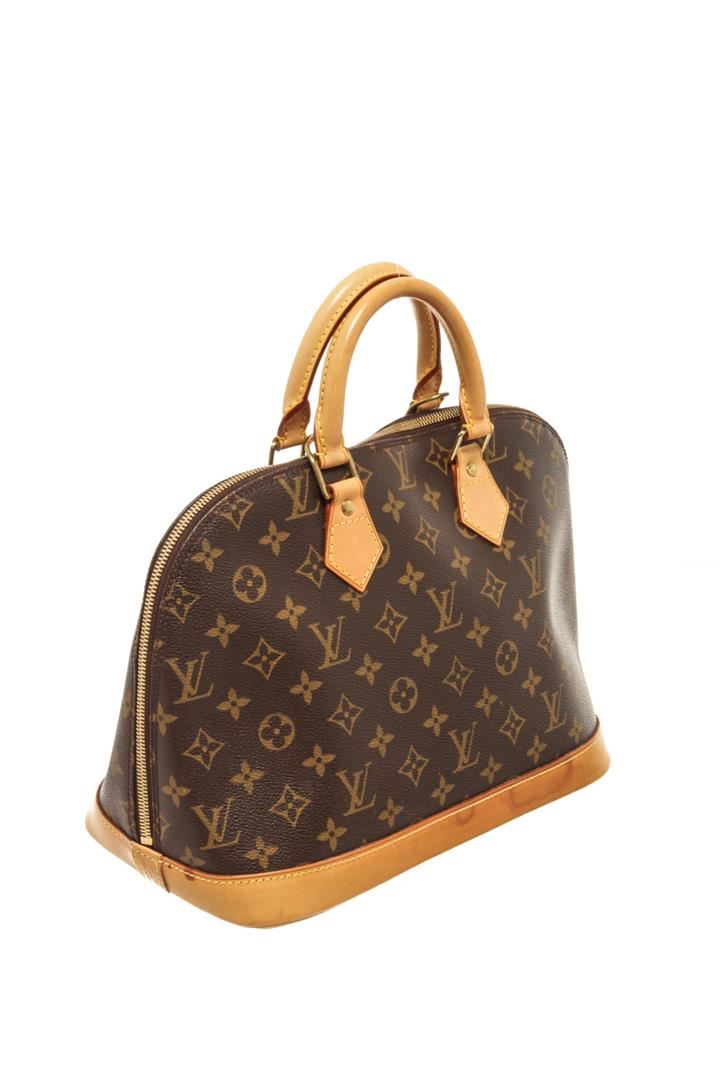 One Louis Vuitton Brown Monogram Alma PM Bag. Item is sold AS-IS. All available information is listed in the description and shown in the photo. Louis Vuitton Brown Monogram Alma PM Bag with top handle, canvas lining, interior slip pockets, gold tone hardware, zipper closure. There is some wear on the bottom of the bag. Height: 8.9" Width: 12.2" Depth: 5.9", Handle Drop: 3.1" / 22.60 x 30.98 x 14.98 Cm