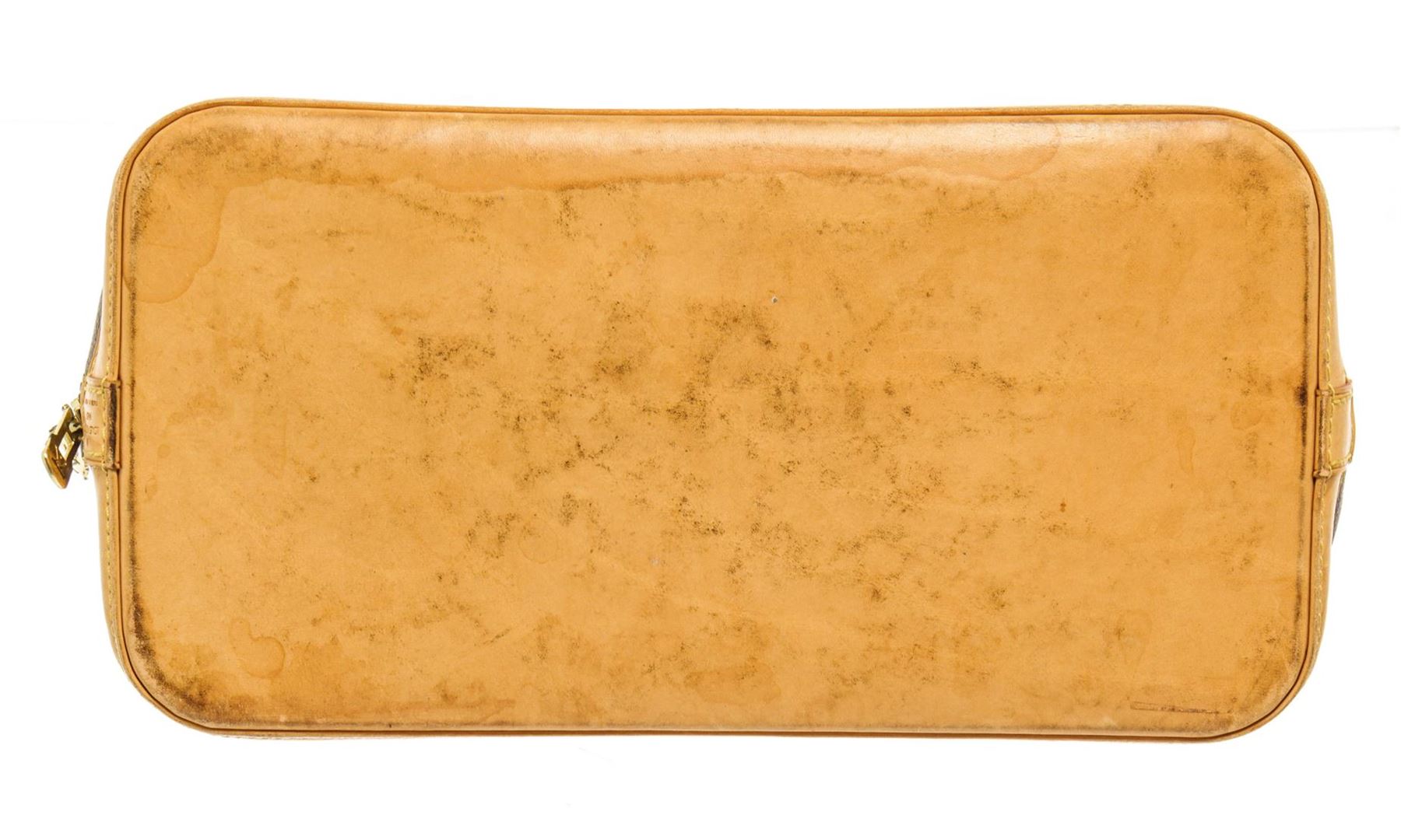 One Louis Vuitton Brown Monogram Alma PM Handbag. Item is sold AS-IS. All available information is listed in the description and shown in the photo. Louis Vuitton Brown Monogram Alma PM Handbag with gold tone hardware, leather trim, rolled handles, leather trim embellishment, canvas lining & single interior pocket, zip closure at top Height: 9.5" Width: 12" Depth: 6.5" Handle Drop: 3.25" / 24.1 x 30.4 x 16.5 Cm