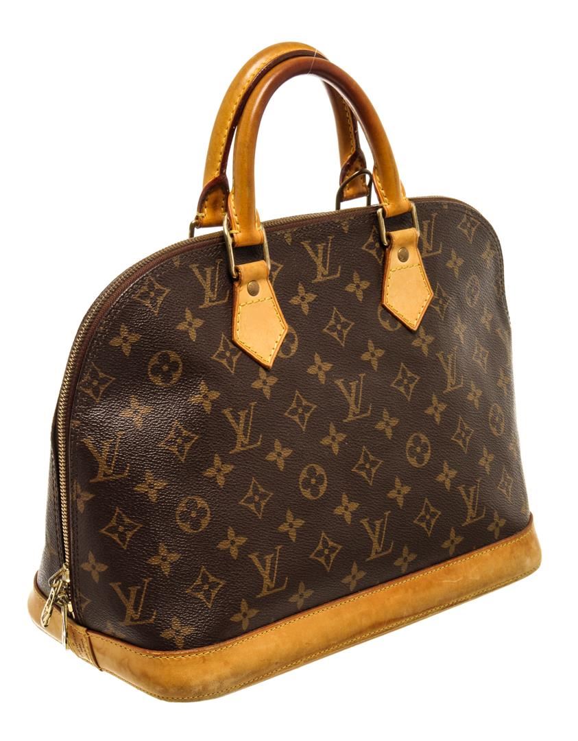 One Louis Vuitton Brown Monogram Alma PM Handbag. Item is sold AS-IS. All available information is listed in the description and shown in the photo. Louis Vuitton Brown Monogram Alma PM Handbag with gold tone hardware, leather trim, rolled handles, leather trim embellishment, canvas lining & single interior pocket, zip closure at top Height: 9.5" Width: 12" Depth: 6.5" Handle Drop: 3.25" / 24.1 x 30.4 x 16.5 Cm