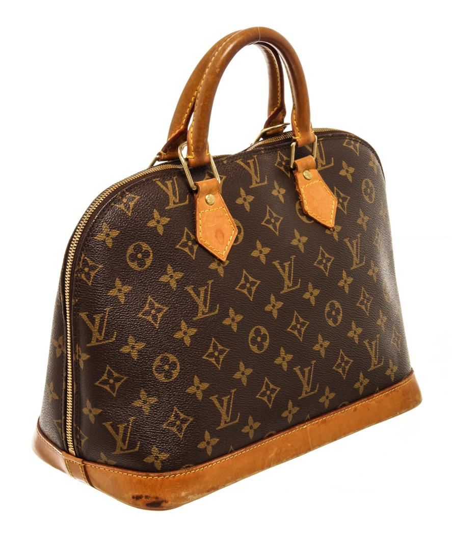 One Louis Vuitton Brown Monogram Canvas Alma GM Satchel Bag. Item is sold AS-IS. All available information is listed in the description and shown in the photo. louis vuitton brown monogram canvas alma gm satchel bag with the alma pm a monogram canvas body, rolled leather handles, a leather bottom, a top zip closure, and an interior slip pocket. Depth 6.7 in, Handle 3.1 in, Height 9.4 in, Width 12.2 in / Depth 17 cm, Handle 8 cm, Height 24 cm, Width 31 cm