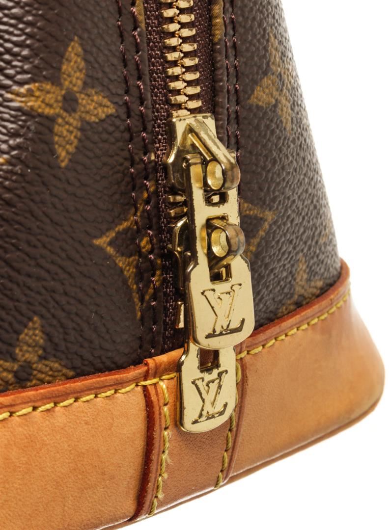 One Louis Vuitton Brown Monogram Canvas Alma Handbag. Item is sold AS-IS. All available information is listed in the description and shown in the photo. Louis Vuitton Brown Monogram Canvas Alma PM Handbag with the alma pm features a monogram canvas body, rolled leather handles, a leather bottom, a top zip closure, and an interior slip pocket. W: 12.20" x H: 9.44" x D: 6.69" / W31cm x H24cm x D17cm