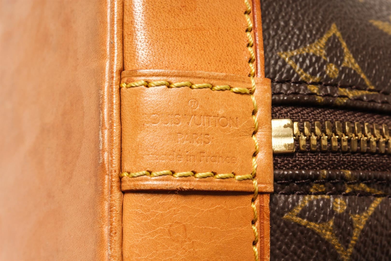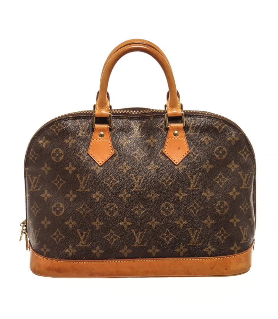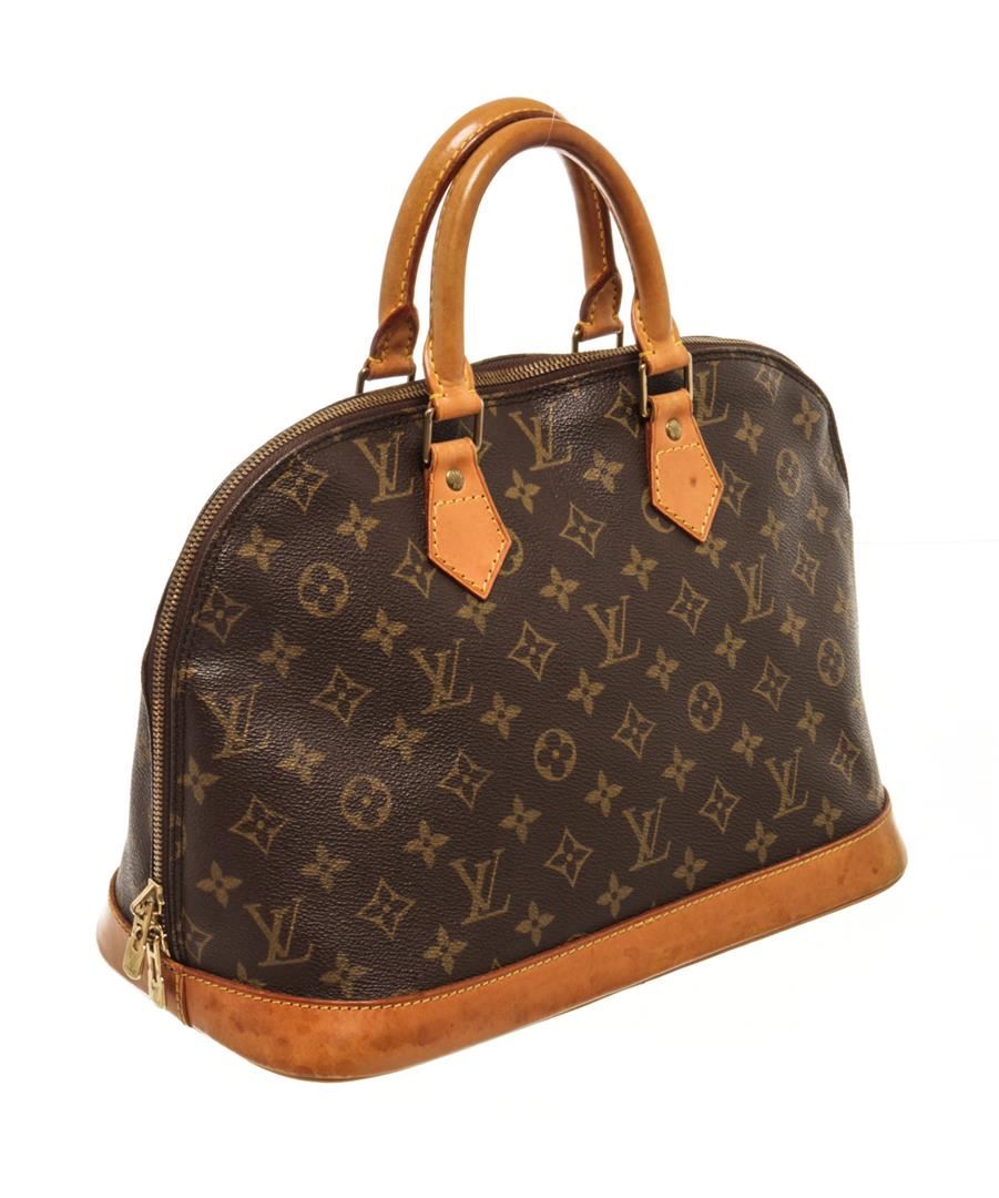 One Louis Vuitton Brown Monogram Canvas Alma Handbag. Item is sold AS-IS. All available information is listed in the description and shown in the photo. Louis Vuitton Brown Monogram Canvas Alma Shoulder Bag top handle, vachetta leather, canvas lining, interior slip pocket, gold tone hardware, zip closure. 9.05 x 12.99 x 5.90 / 23cm x 33cm x 15cm