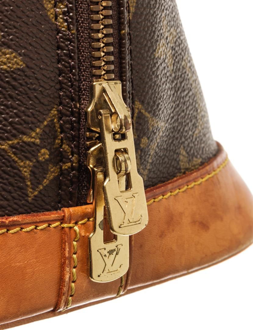 One Louis Vuitton Brown Monogram Canvas Alma Handbag. Item is sold AS-IS. All available information is listed in the description and shown in the photo. Louis Vuitton Brown Monogram Canvas Alma Shoulder Bag top handle, vachetta leather, canvas lining, interior slip pocket, gold tone hardware, zip closure. 9.05 x 12.99 x 5.90 / 23cm x 33cm x 15cm