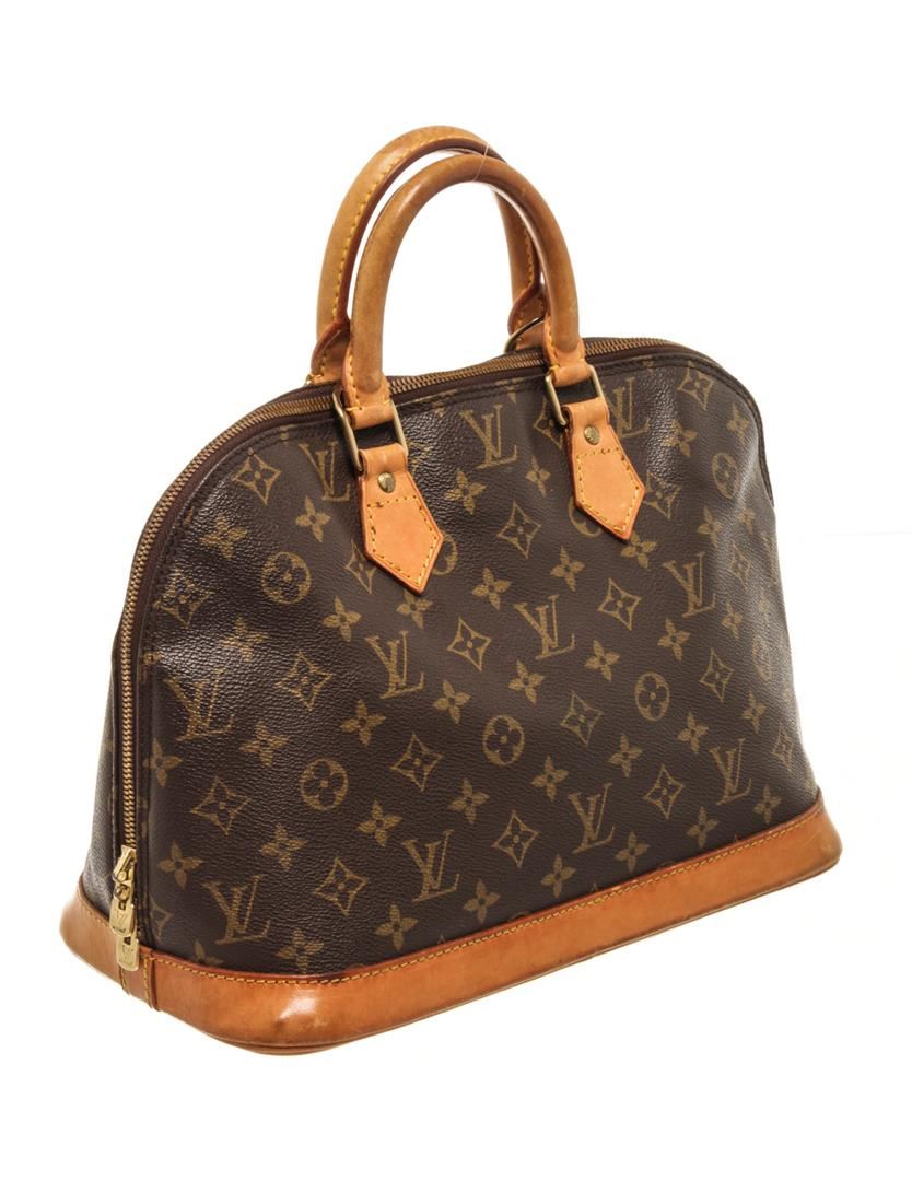 One Louis Vuitton Brown Monogram Canvas Alma Handbag. Item is sold AS-IS. All available information is listed in the description and shown in the photo. Louis Vuitton Brown Monogram Canvas and Leather Alma PM Bag with constructed from monogram canvas and leather it displays dual handles at the top gold tone hardware and a padlock. the fabric lined interior of the bag is secured by a zipper closure at the top. Bottom of the bag and corners is worn. Please refer to photos. H:9.25" x W:11.81" x D:6.29" / H:23.5cm x W:30cm x D:16cm