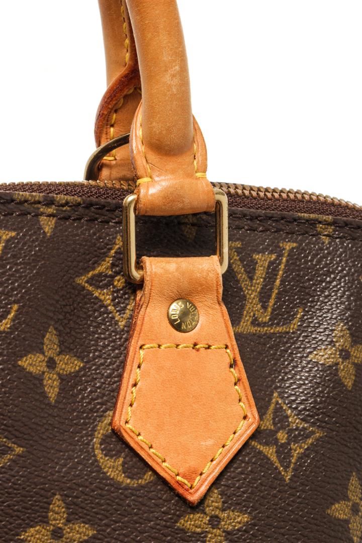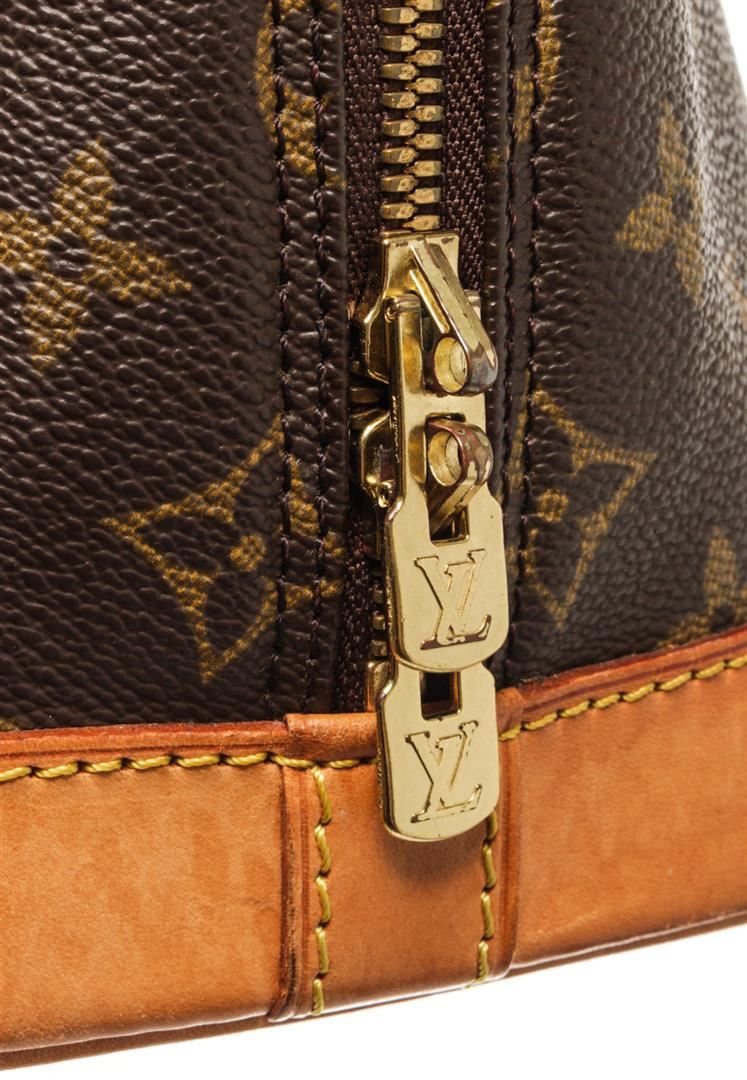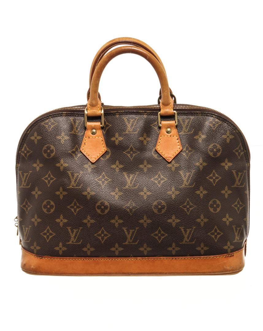 One Louis Vuitton Brown Monogram Canvas Alma Handbag. Item is sold AS-IS. All available information is listed in the description and shown in the photo. Louis Vuitton Brown Monogram Canvas and Leather Alma PM Bag with constructed from monogram canvas and leather it displays dual handles at the top gold tone hardware and a padlock. the fabric lined interior of the bag is secured by a zipper closure at the top. Bottom of the bag and corners is worn. Please refer to photos. H:9.25" x W:11.81" x D:6.29" / H:23.5cm x W:30cm x D:16cm