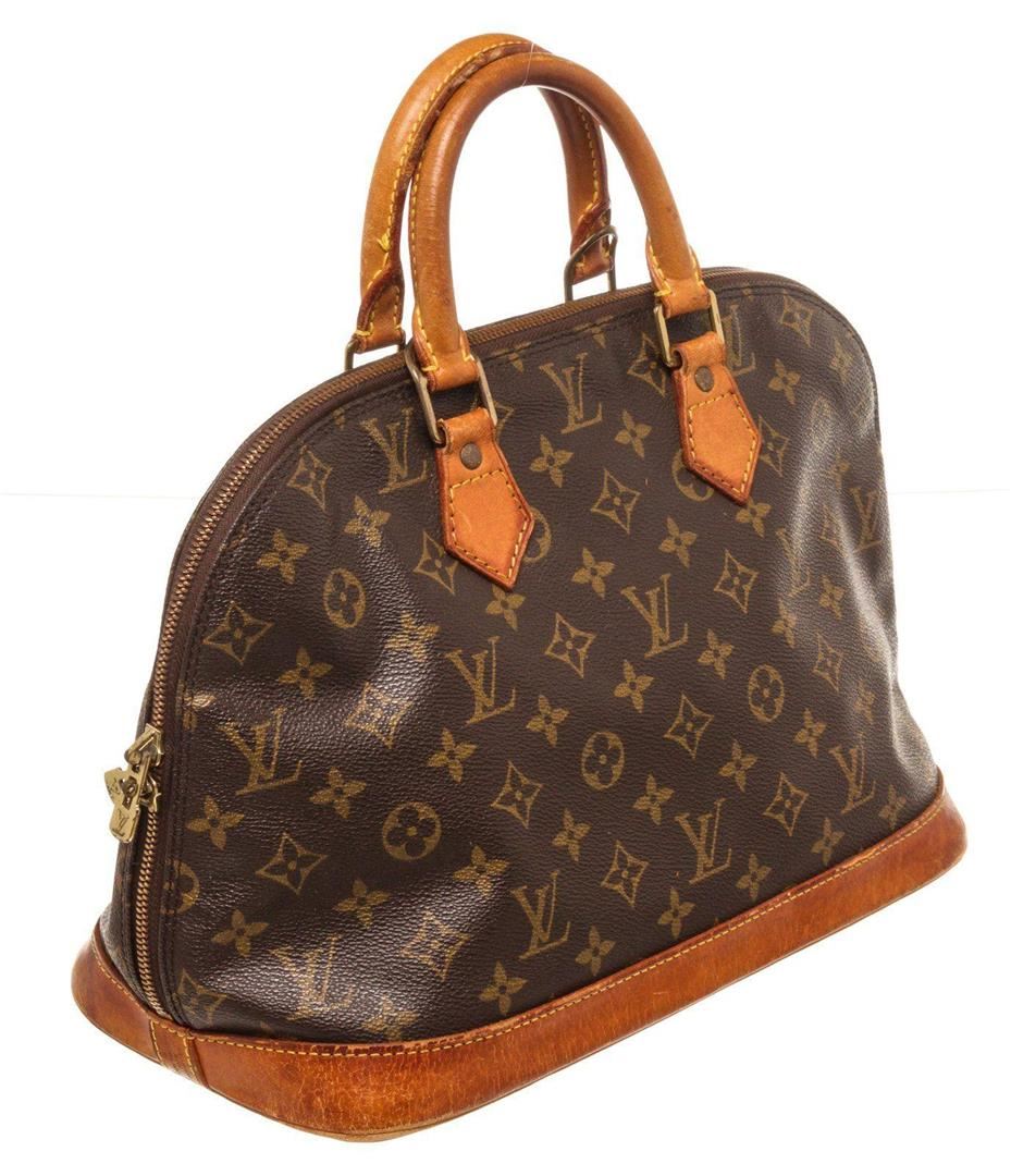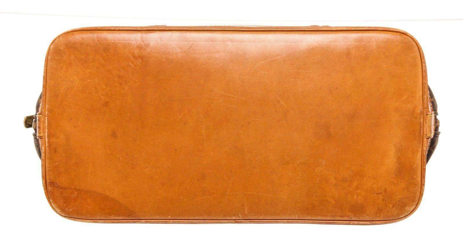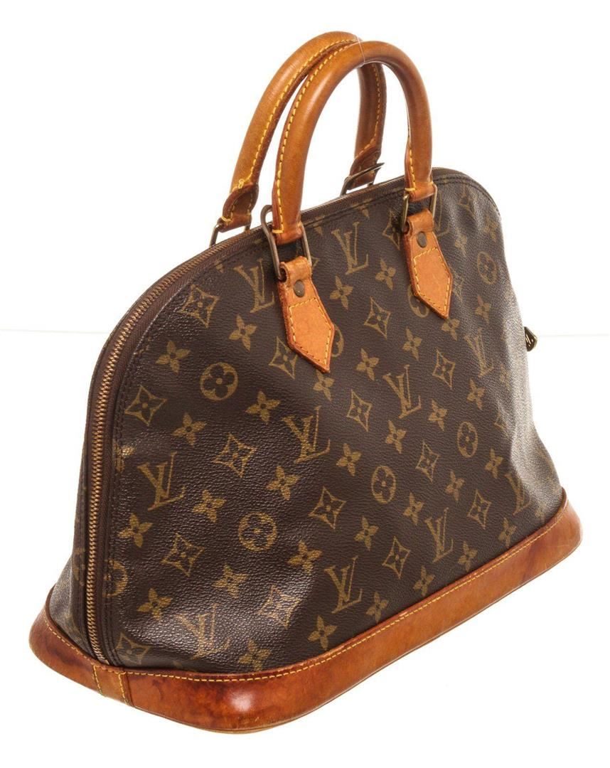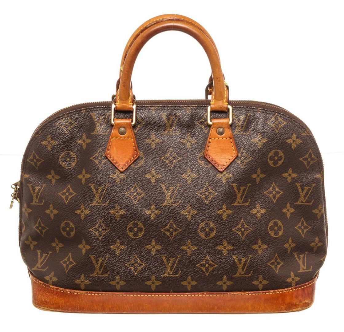 Louis Vuitton Brown Monogram Canvas Alma MM Satchel Bag with gold-tone hardware, tan vachetta leather trim, interior zip pockets, canvas lining, dual flat shoulder straps, and zip closure.