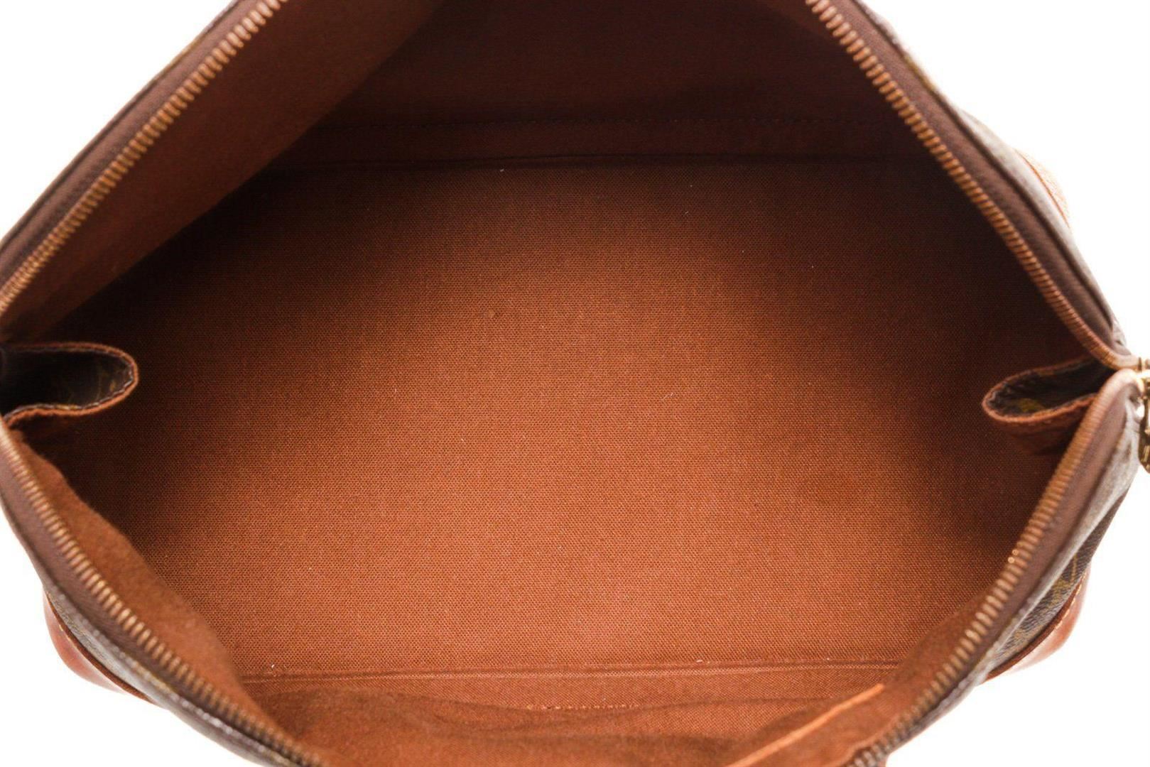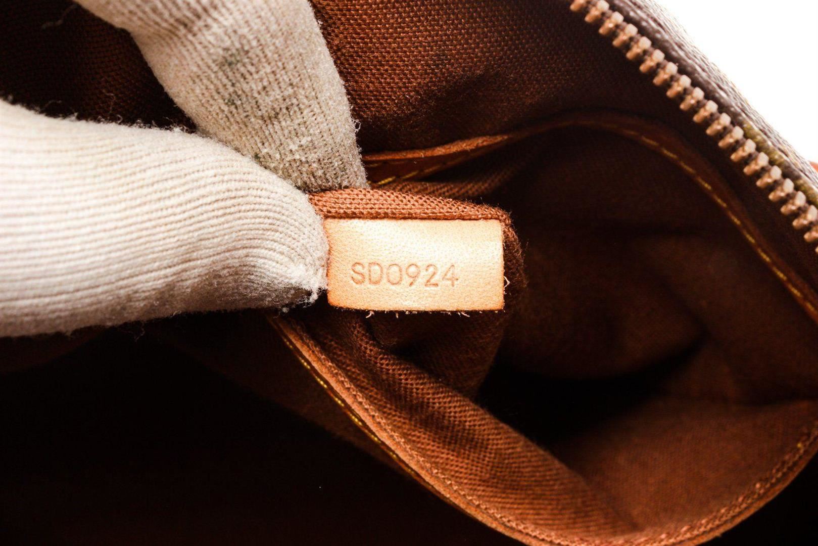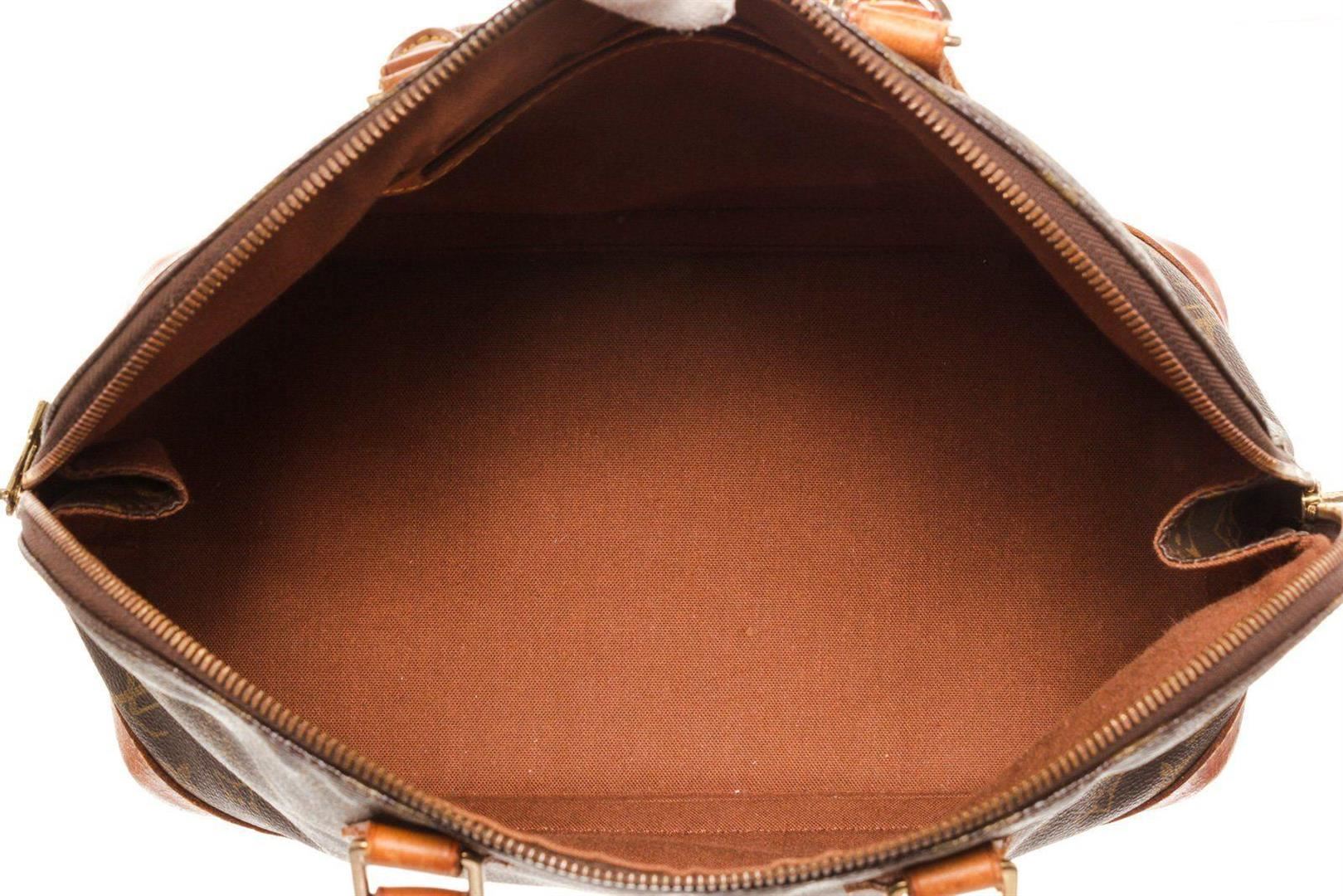 Louis Vuitton Brown Monogram Canvas Alma MM Satchel Bag with gold-tone hardware, tan vachetta leather trim, interior zip pockets, canvas lining, dual flat shoulder straps, and zip closure.