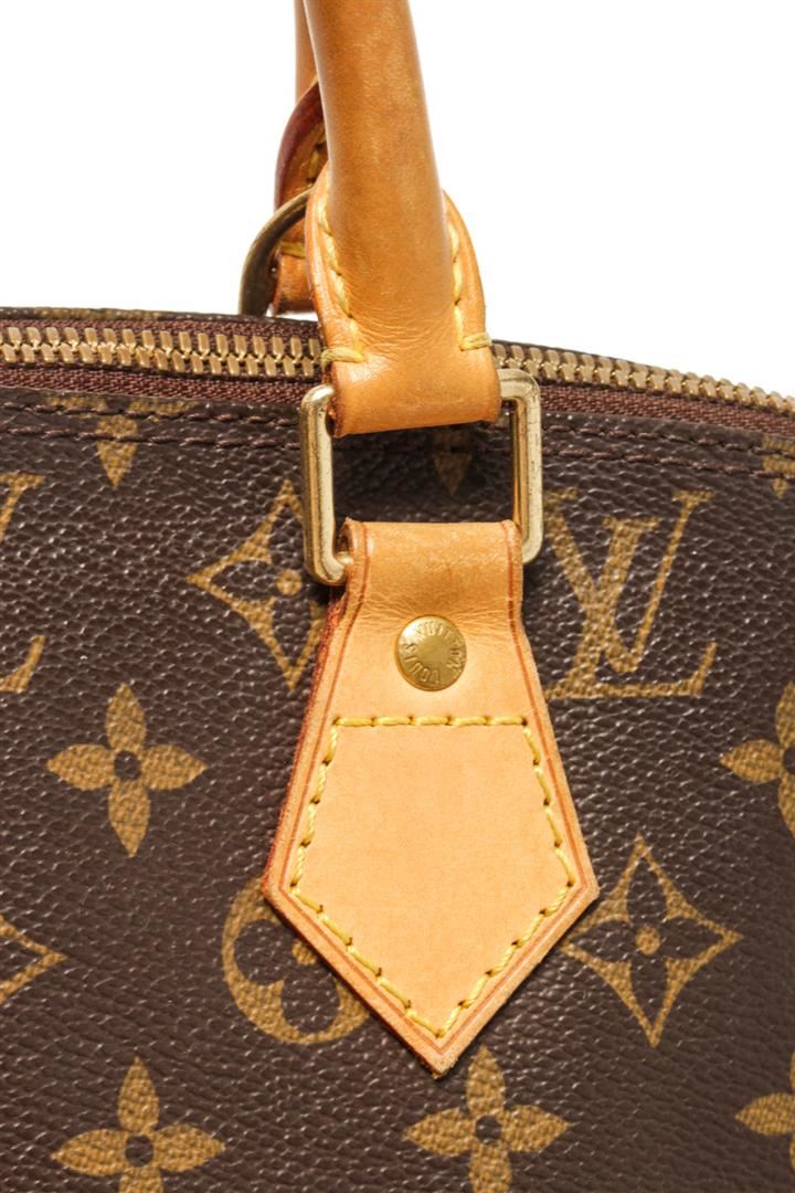 One Louis Vuitton Brown Monogram Canvas Alma PM Bag. Item is sold AS-IS. All available information is listed in the description and shown in the photo. louis vuitton brown monogram canvas alma pm bag with the alma pm features a monogram canvas body, rolled leather handles, a leather bottom, a top zip closure, and an interior slip pocket. Height: 8.9" Width: 11.4" Depth: 5.9" , Handle Drop: 3.1" / 22.60 x 28.95 x 14.98 Cm