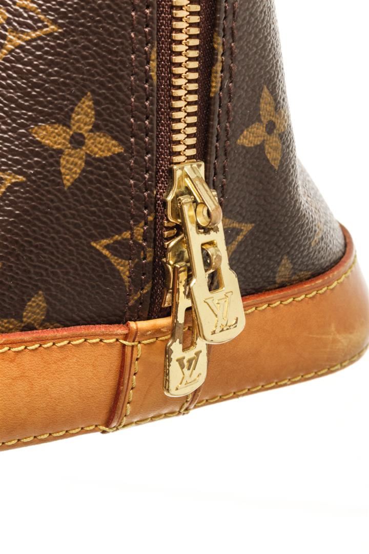 One Louis Vuitton Brown Monogram Canvas Alma PM Bag. Item is sold AS-IS. All available information is listed in the description and shown in the photo. louis vuitton brown monogram canvas alma pm bag with the alma pm features a monogram canvas body, rolled leather handles, a leather bottom, a top zip closure, and an interior slip pocket. Height: 8.9" Width: 11.4" Depth: 5.9", Handle Drop: 3.1" / 22.60 x 28.95 x 14.98 Cm