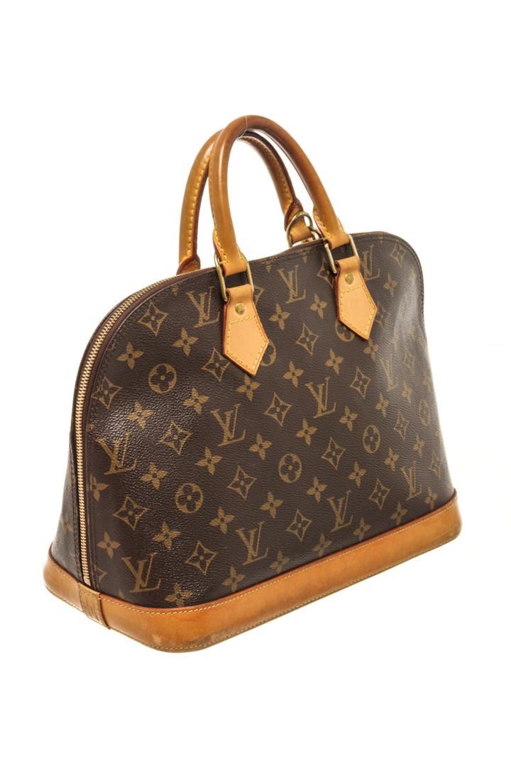 One Louis Vuitton Brown Monogram Canvas Alma PM Bag. Item is sold AS-IS. All available information is listed in the description and shown in the photo. louis vuitton brown monogram canvas alma pm bag with the alma pm features a monogram canvas body, rolled leather handles, a leather bottom, a top zip closure, and an interior slip pocket. Height: 8.9" Width: 11.4" Depth: 5.9", Handle Drop: 3.1" / 22.60 x 28.95 x 14.98 Cm