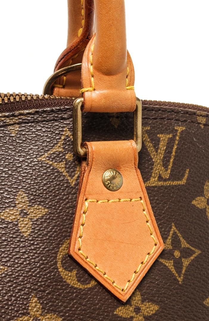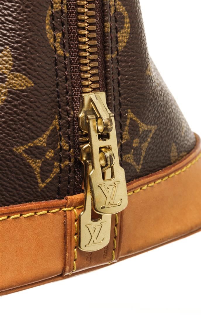 One Louis Vuitton Brown Monogram Canvas Alma PM Handbag. Item is sold AS-IS. All available information is listed in the description and shown in the photo. Louis Vuitton Brown Monogram Canvas Alma PM Handbag with the alma pm features a monogram canvas body, rolled leather handles, a leather bottom, a top zip closure, and an interior slip pocket. There is a huge brown stain on bottom of bag as shown in photos. 9.05" x 11.41" x 6.10" Inches / Length: 23.00cm x Width: 29.00cm x Depth: 15.50cm.