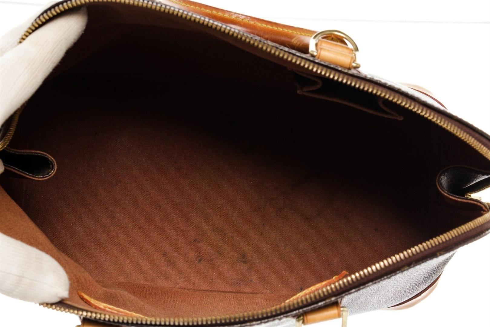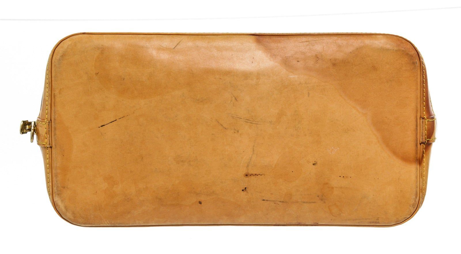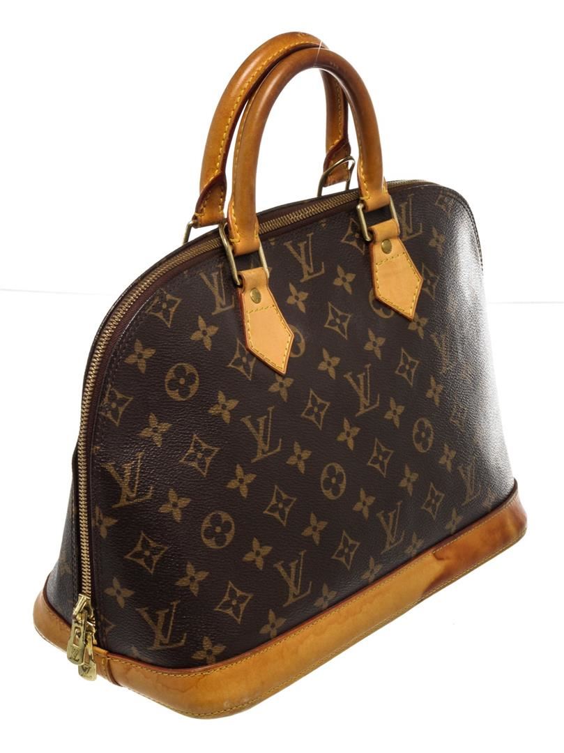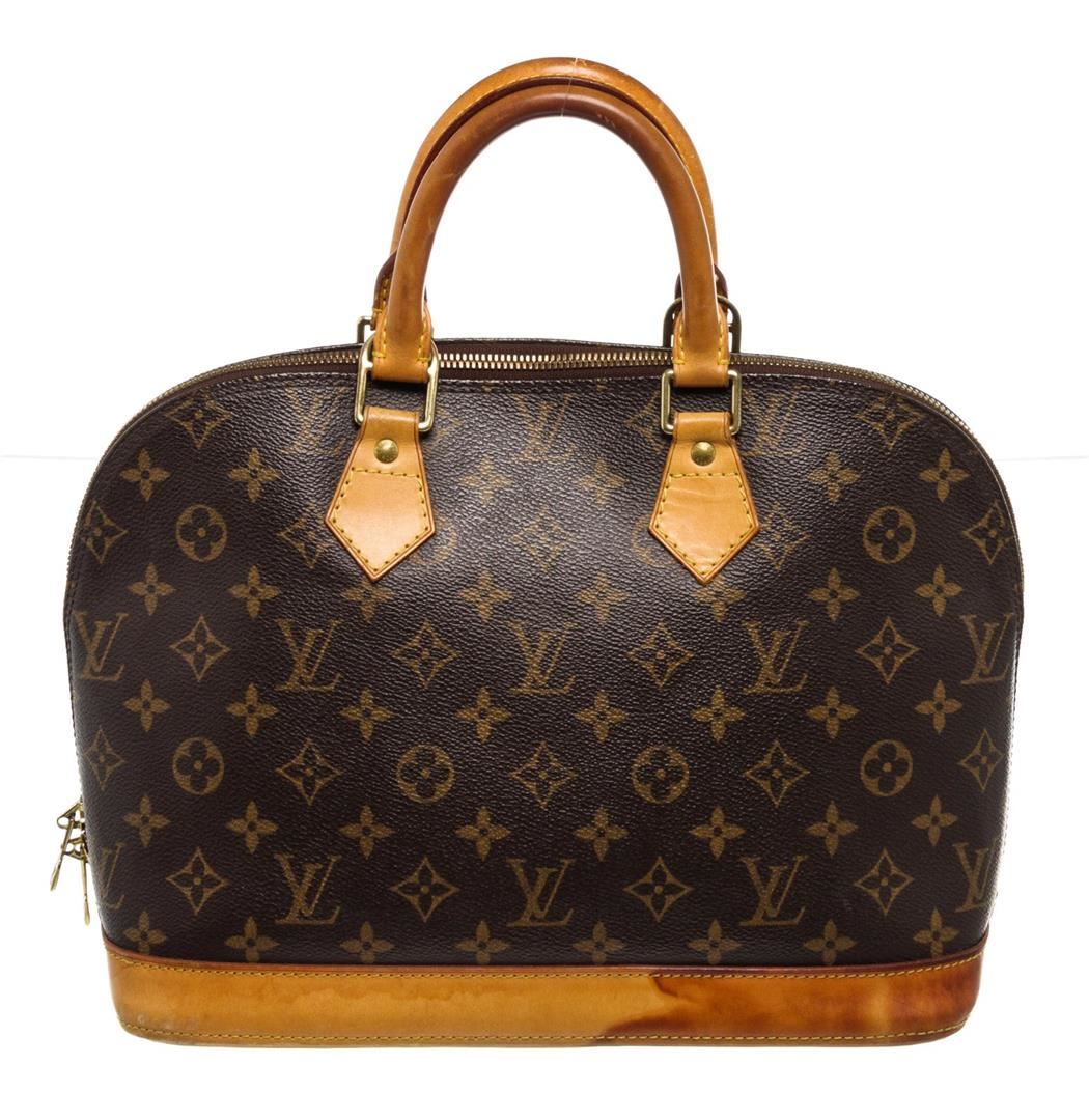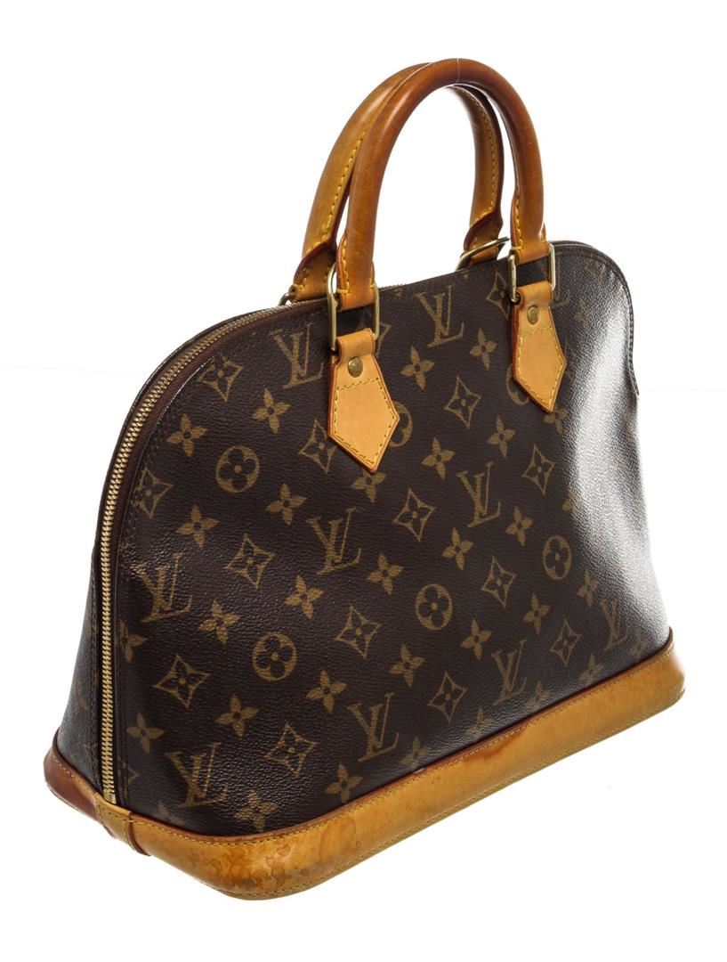 Louis Vuitton Brown Monogram Canvas Alma PM Satchel Bag with monogram canvas, gold-tone hardware, trim tan vachetta leather, interior slip pockets, dual top handle and zipper closure.