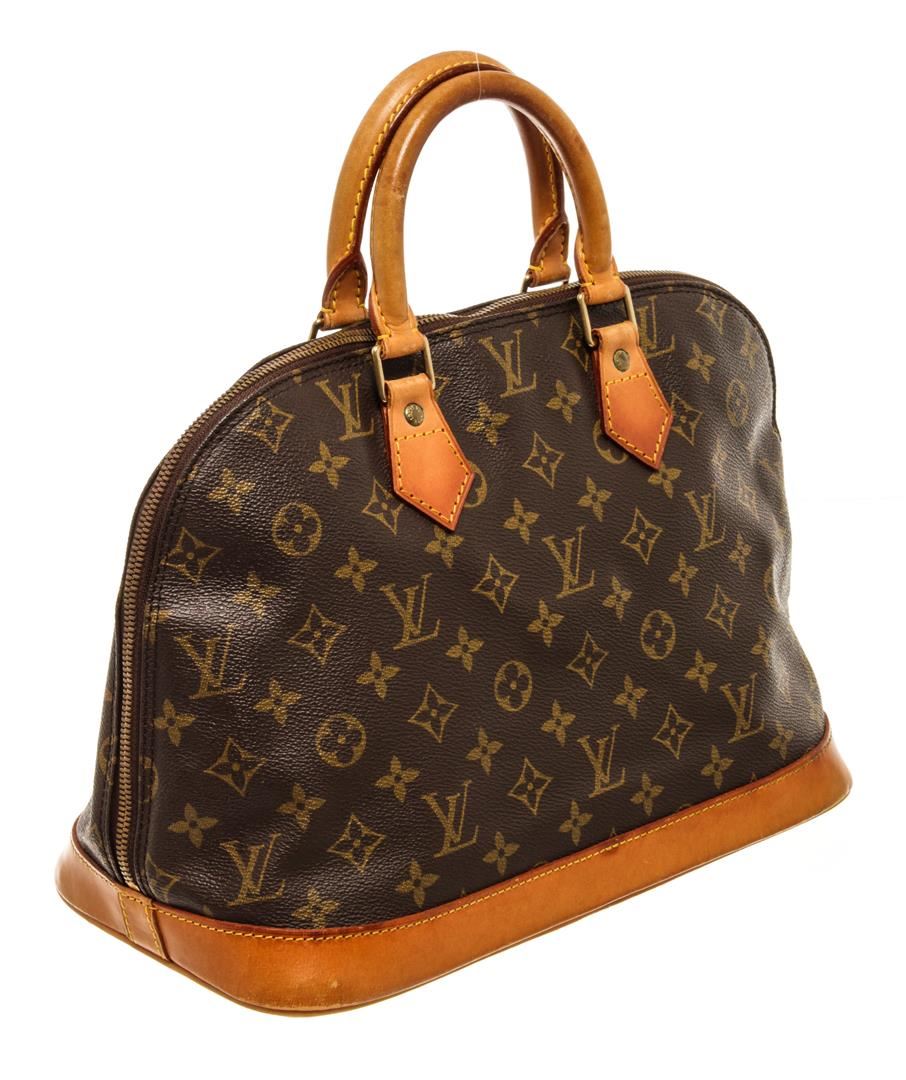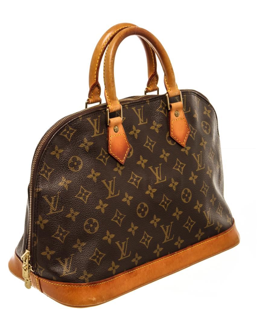 One Louis Vuitton Brown Monogram Canvas Alma PM Satchel Bag. Item is sold AS-IS. All available information is listed in the description and shown in the photo. brown louis vuitton monogram alma pm bag with the alma pm features a monogram canvas body, rolled leather handles, a leather bottom, a top zip closure, and an interior slip pocket. 8.9" L x 11.4" W x 5.9" D / 22.60 x 28.95 x 14.98 CM