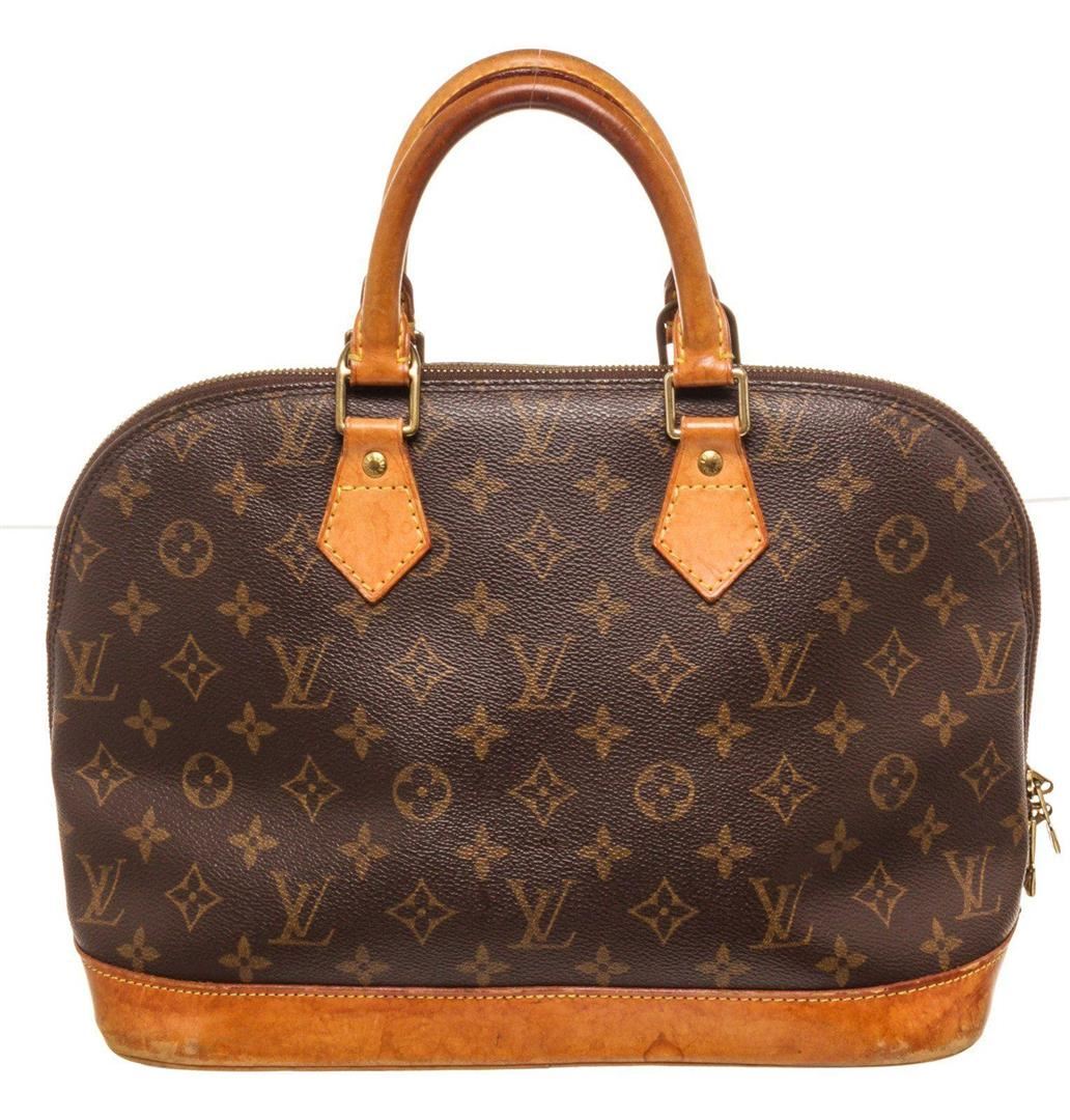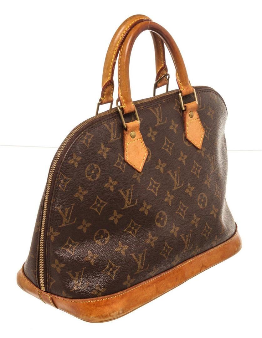 Louis Vuitton Brown Monogram Canvas Alma Satchel Bag with gold-tone hardware, tan vachetta leather trim, interior zip pockets, canvas lining, dual rolled handles, and zip top closure.