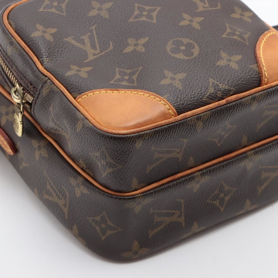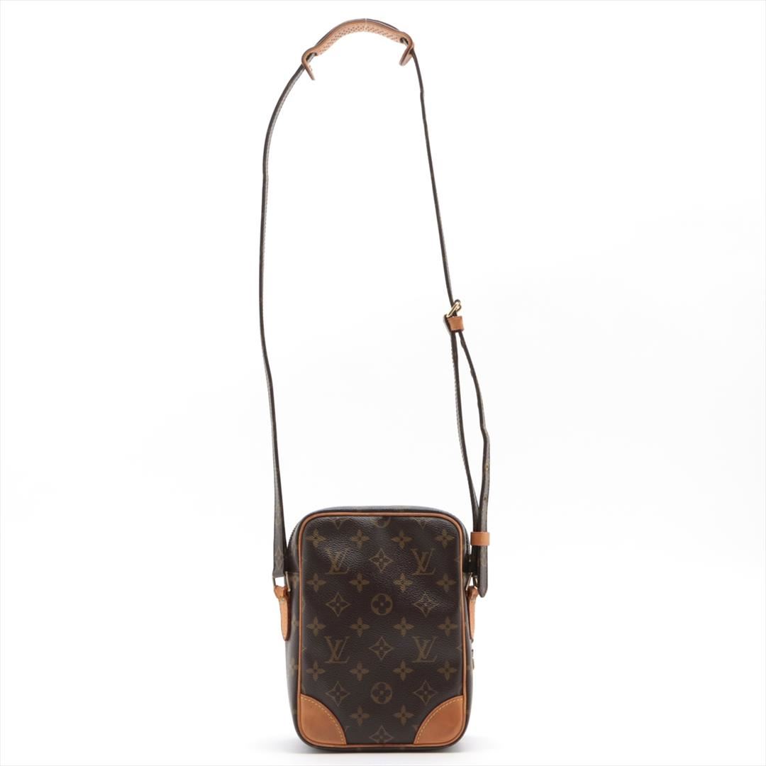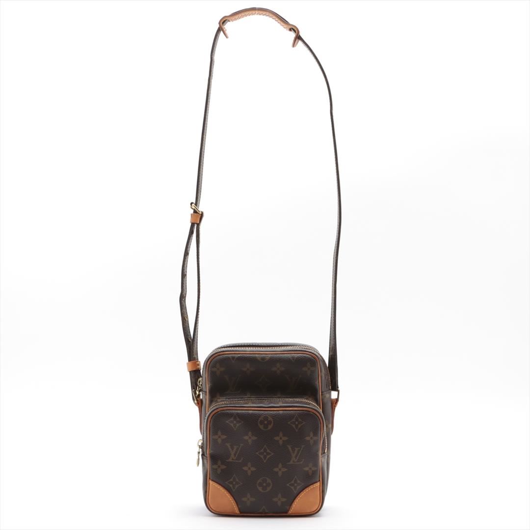 Brown and tan monogram coated canvas Louis Vuitton Amazon crossbody bag with gold-tone hardware, tan vachetta leather trim, flat shoulder strap, exterior zip pocket, brown leather Taiga lining and zip closure at top. 5"x3"x7"xBag Drop:22"/12.7cmx7.6cmx