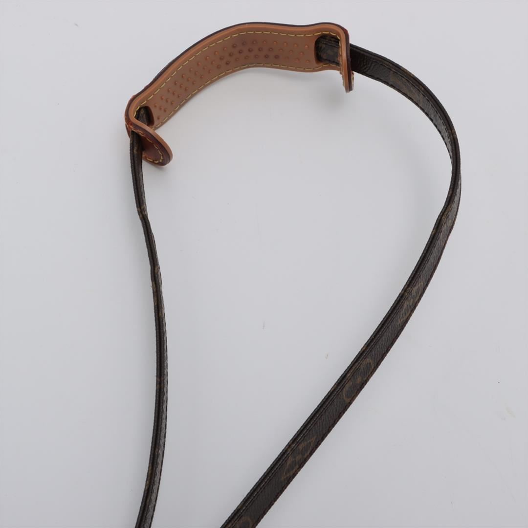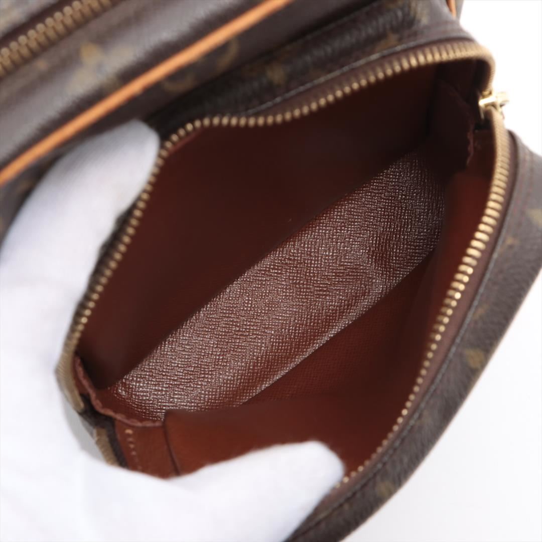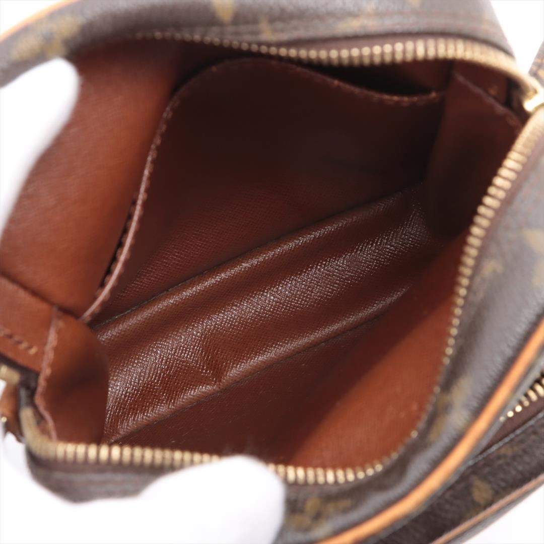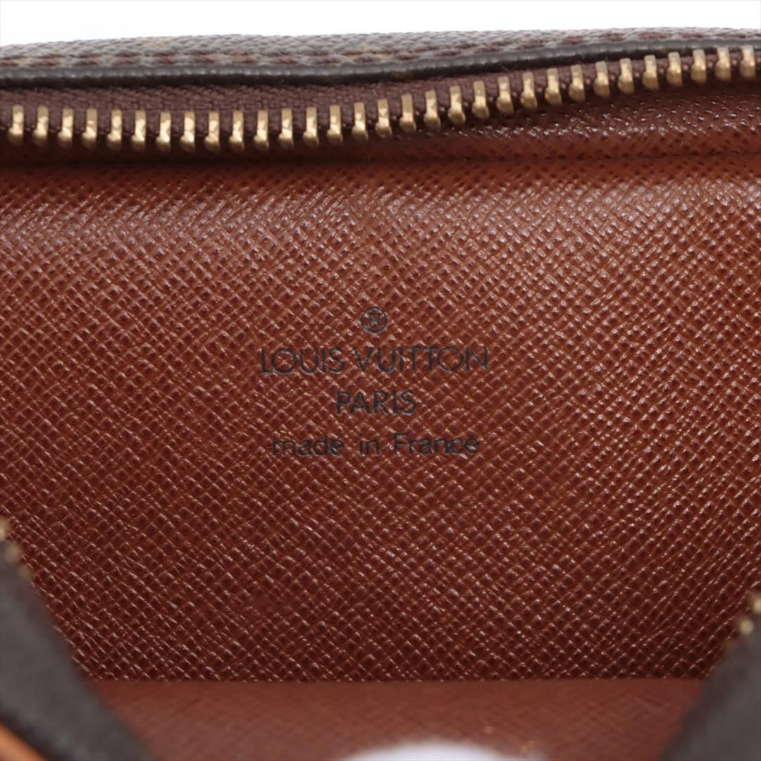 Brown and tan monogram coated canvas Louis Vuitton Amazon crossbody bag with gold-tone hardware, tan vachetta leather trim, flat shoulder strap, exterior zip pocket, brown leather Taiga lining and zip closure at top. 5"x3"x7"xBag Drop:22"/12.7cmx7.6cmx