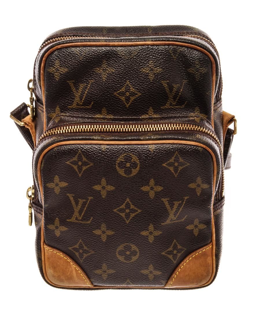 Louis Vuitton Brown Monogram Canvas Amazone Crossbody Bag. All available information is listed in the description and shown in the photos. Louis Vuitton Brown Monogram Canvas Amazone Crossbody Bag with tan vachetta leather trim, brass hardware, adjustable shoulder strap, exterior zip pocket, interior slip pocket and top zip closure. Height: 22.86 cm (9 in), Width: 15.24 cm (6 in), Depth: 8.89 cm (3.5 in)